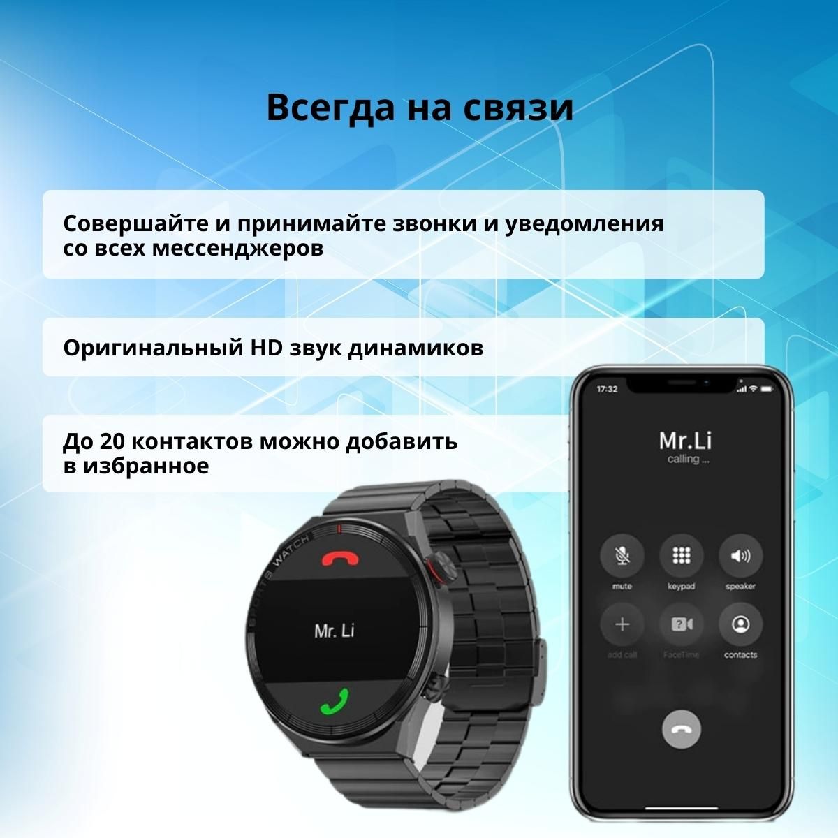 Текст при отключенной в браузере загрузке изображенийЧасы имеют модуль подключения Bluetooth 5.0, благодаря чему достигается максимальная стабильность работы. Вы можете совершать/принимать звонки через часы, а также просматривать сообщения со всех мессенджеров.