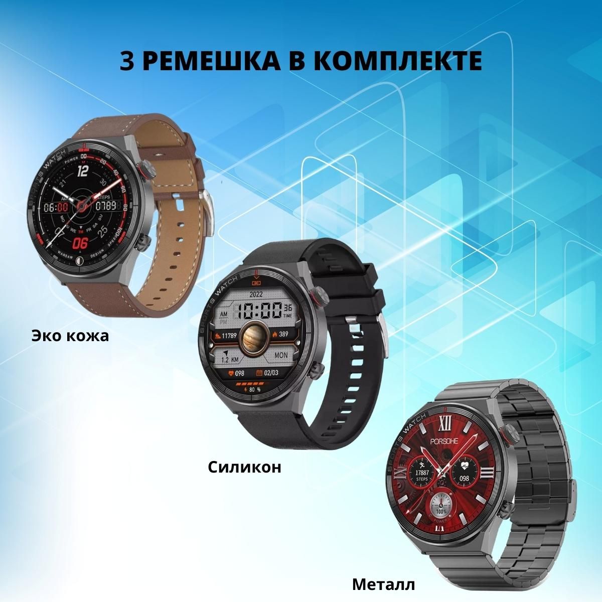 Текст при отключенной в браузере загрузке изображенийВ комплект входят 3 ремешка - силиконовый ремешок чёрного цвета, эко ремешок коричневого цвета, металлический блочный ремешок цвета корпуса.