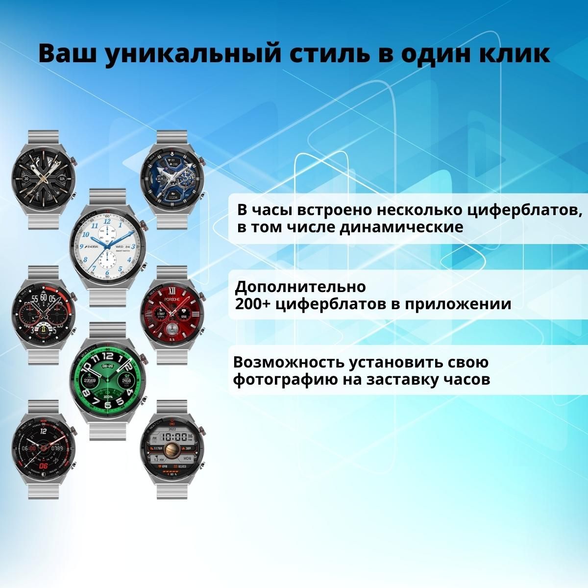 • Различные варианты циферблатов в приложении, дополнительно Вы можете устанавливать свои фотографии на заставку часов
