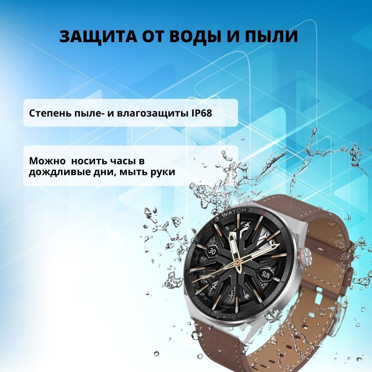 Смарт часы имеют степень пыле- и влагозащиты IP68, поэтому Вы можете носить их в дождливые дни или когда моете руки, однако не рекомендуется в них плавать.