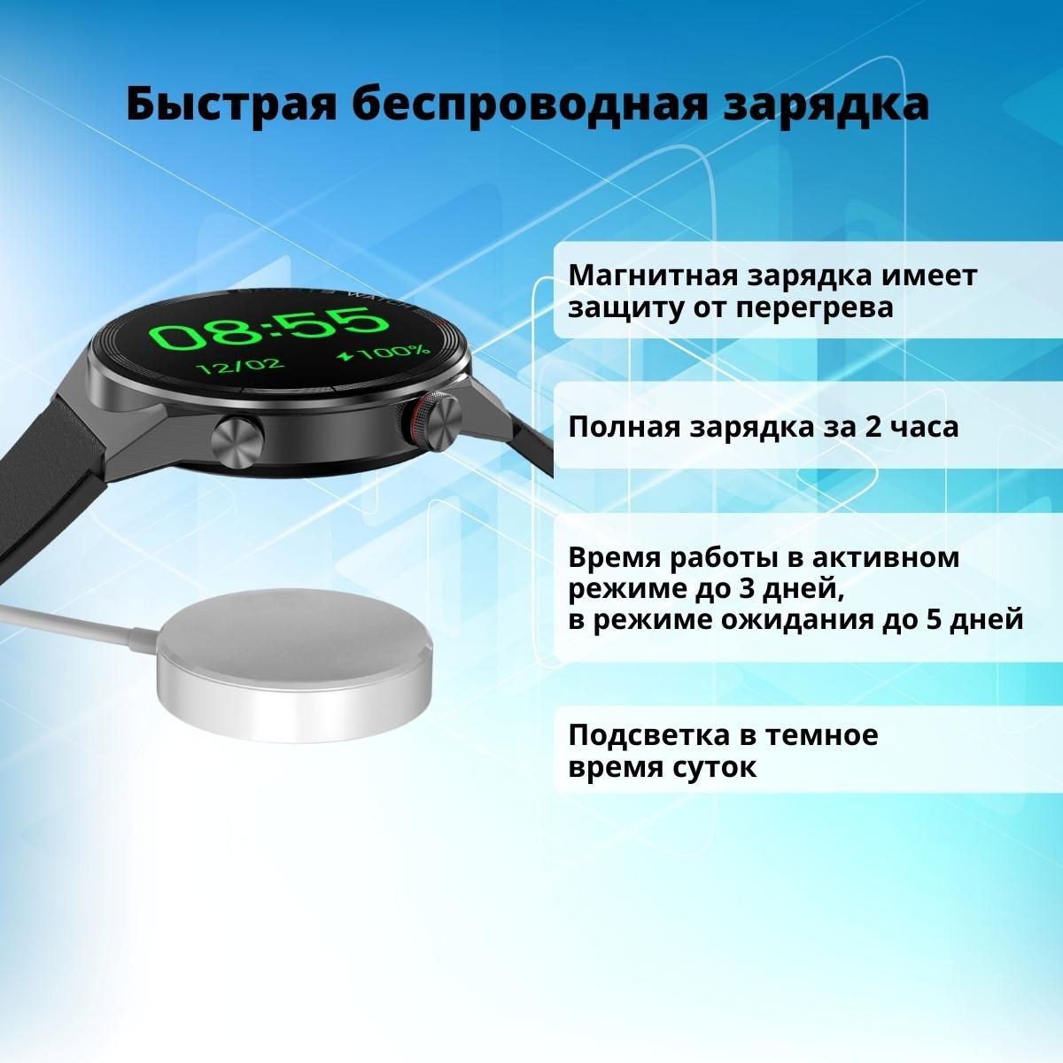 Текст при отключенной в браузере загрузке изображенийУмные часы поддерживаются современной беспроводной зарядкой, имеющей новую модернизированную защиту от перегрева путем автоматического отключение питания при слишком высокой температуре.
