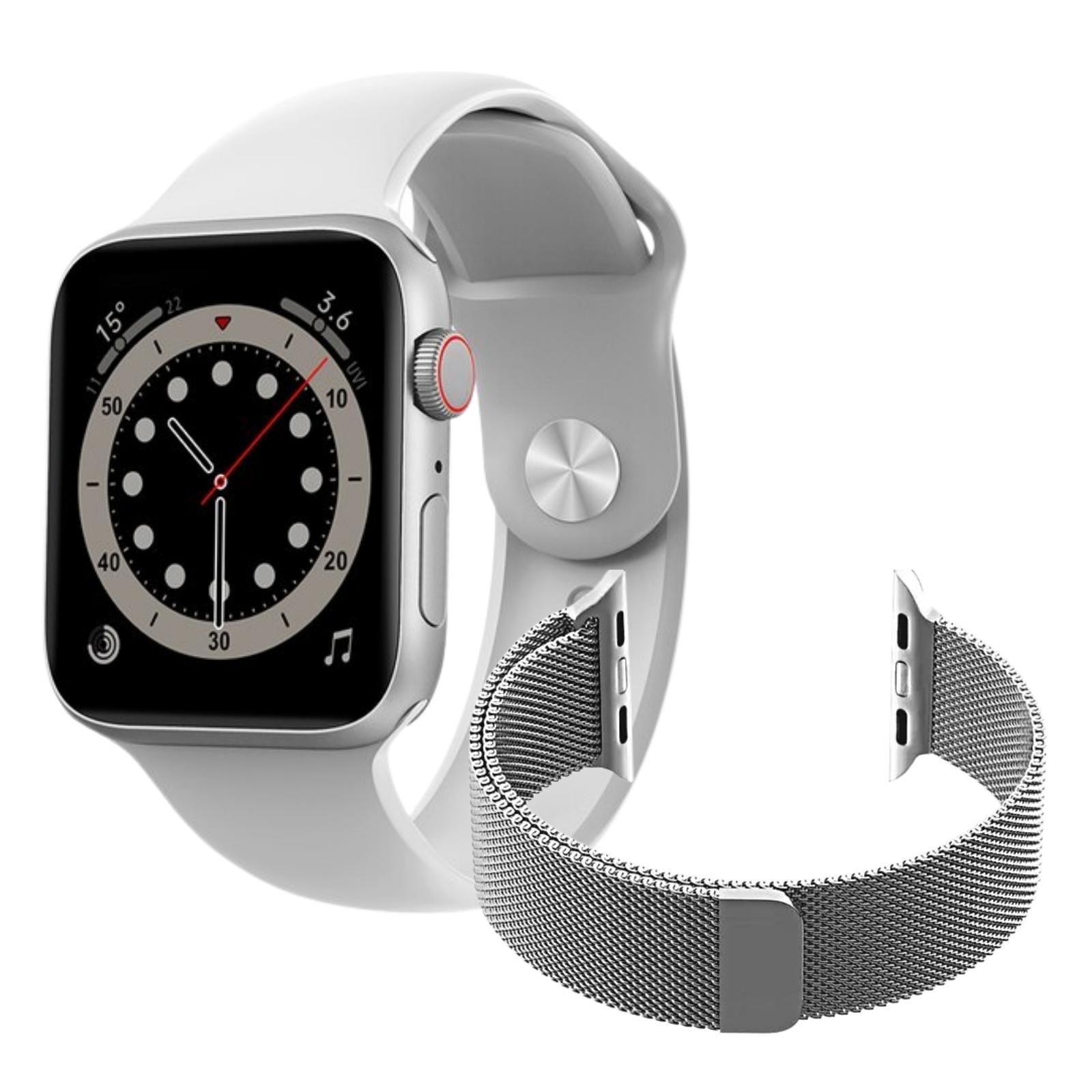 Умные Часы, Силиконовый ремешок, Металлический ремешок Миланская петля, Зарядное беспроводное устройство, Инструкция, Коробка.