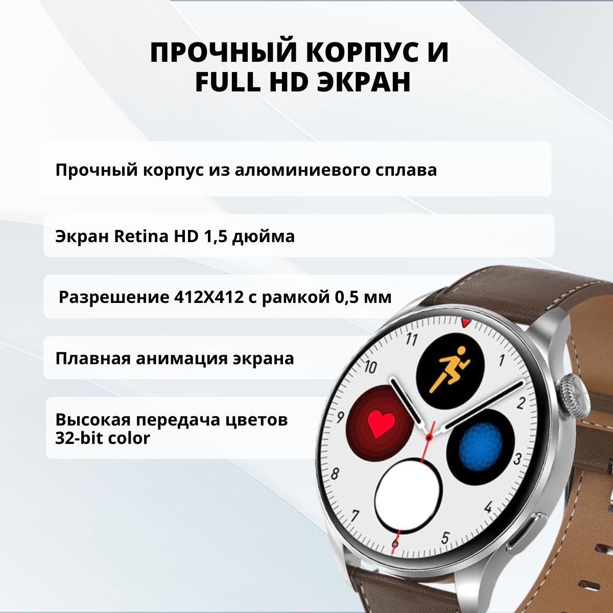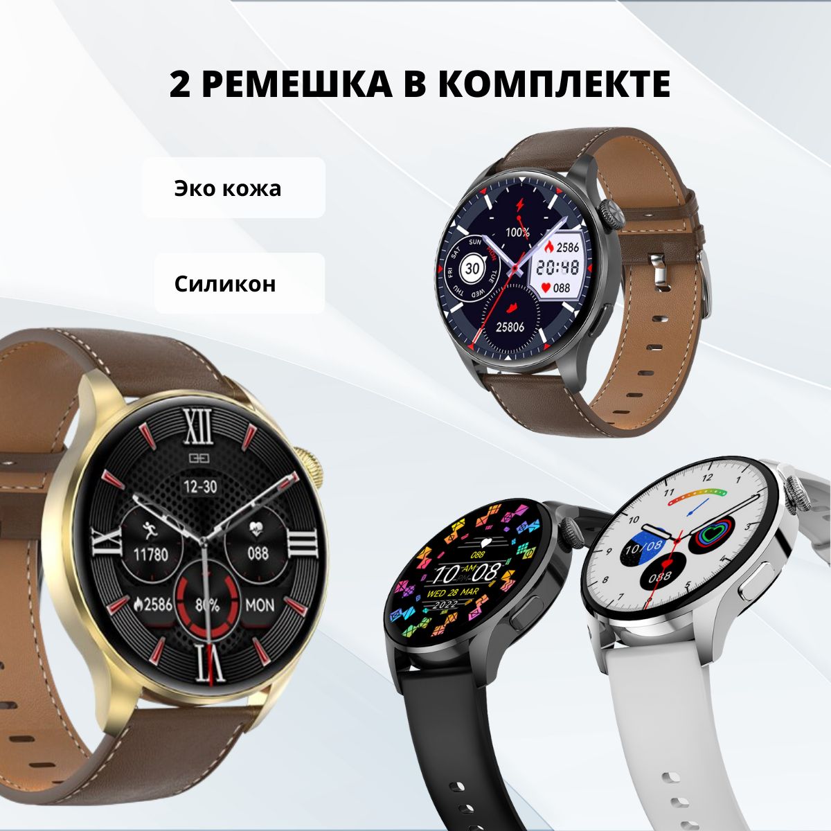 Умные Часы, Силиконовый ремешок, Ремешок из эко кожи, Зарядное беспроводное устройство, Инструкция на русском языке, Коробка.