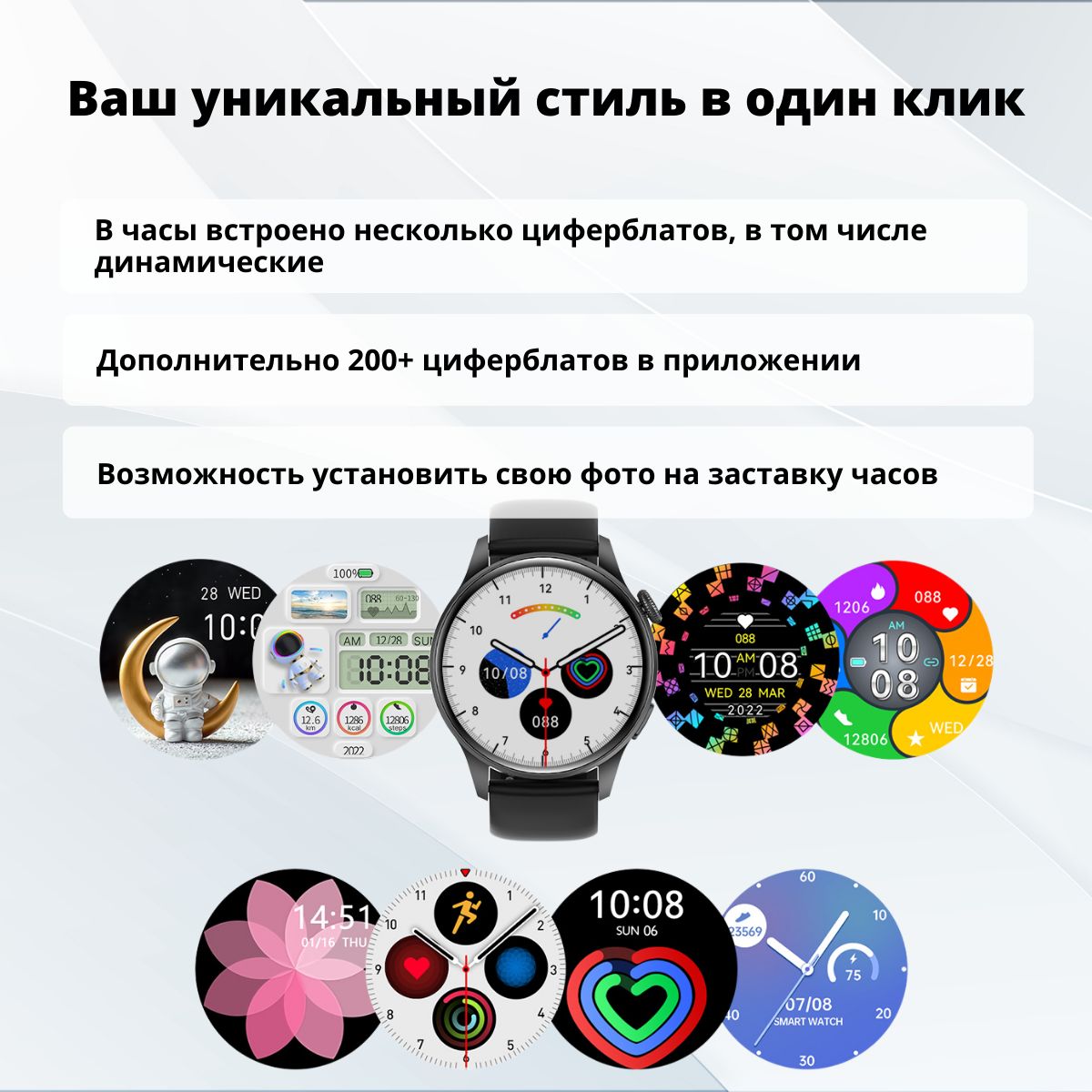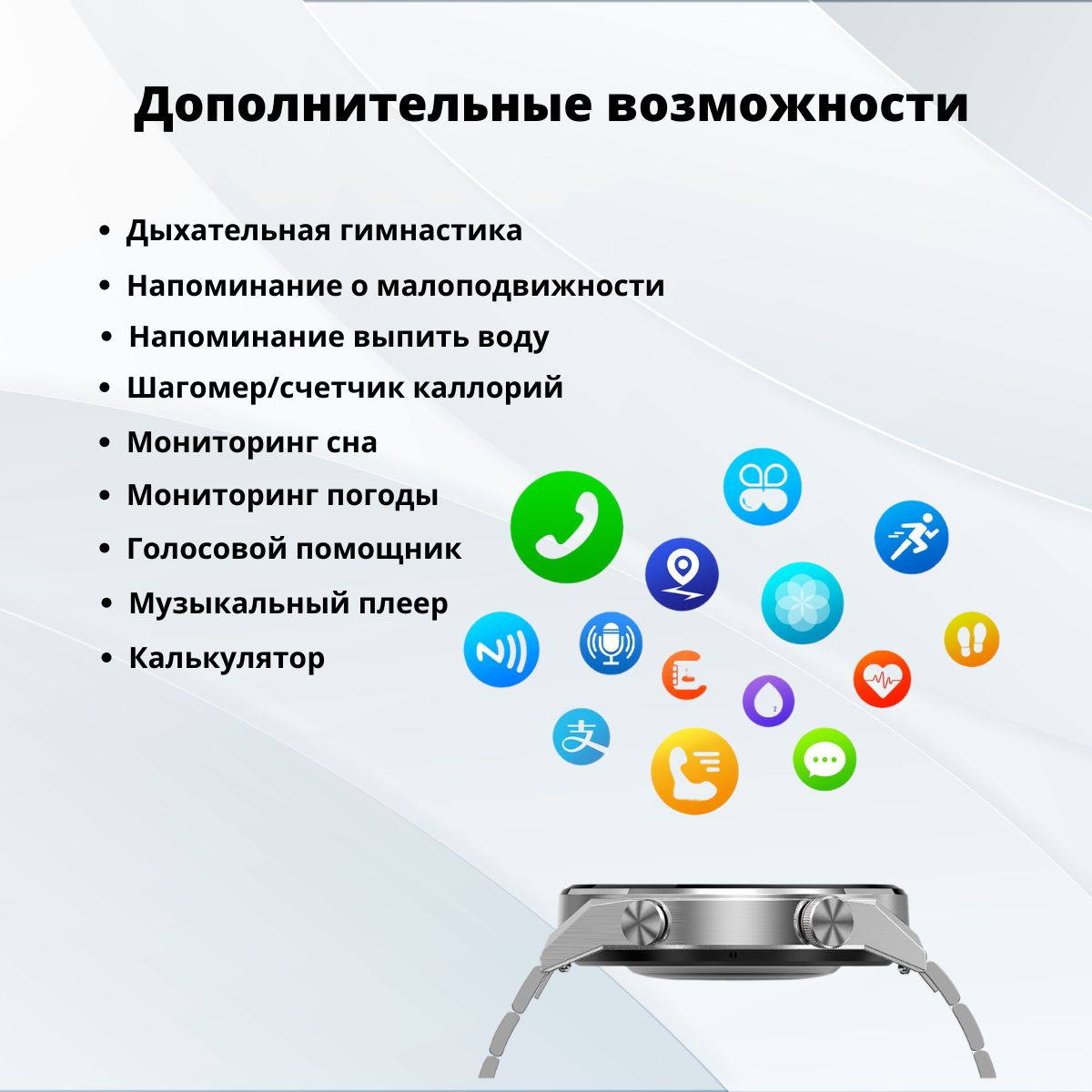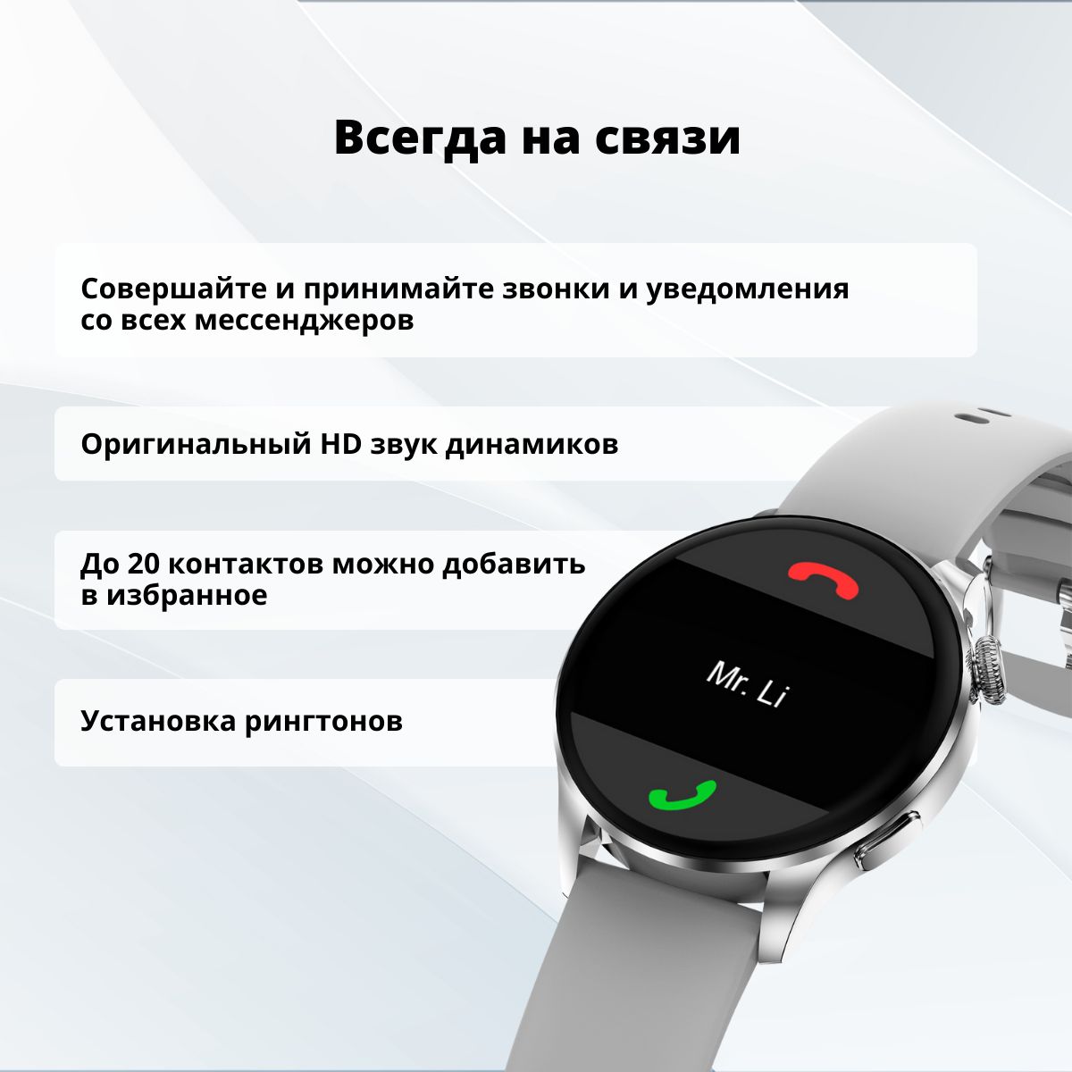 Модуль подключения Bluetooth 5.0 позволяет совершать/принимать звонки через часы, а также просматривать сообщения со всех мессенджеров и соц сетей.