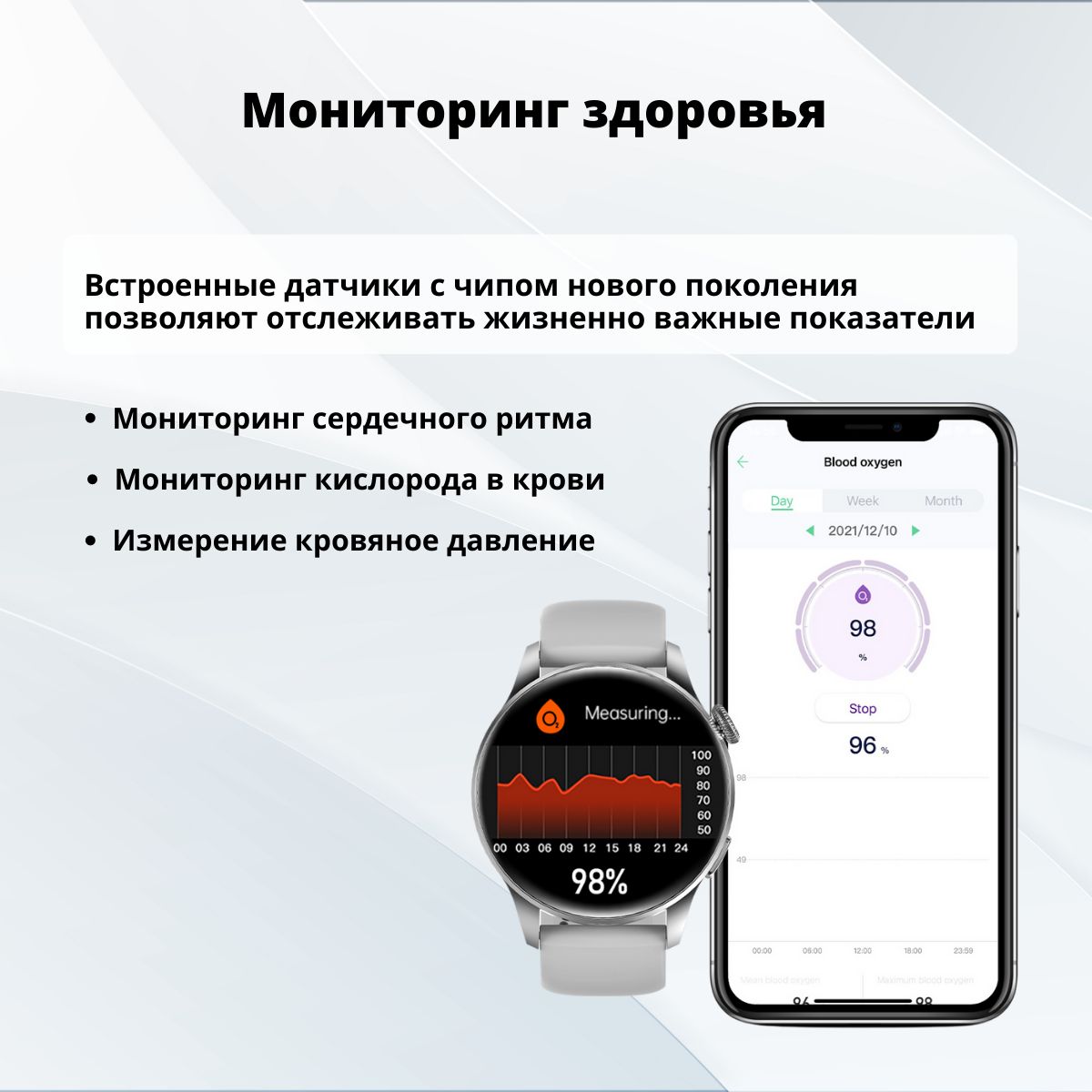 Умные часы могут контролировать параметры Вашего здоровья и накапливать статистику, которую с лёгкостью можно посмотреть в телефоне. В часы встроенные следующие модули для замеров параметров здоровья: сердцебиение, кислород в крови, кровяное давление.