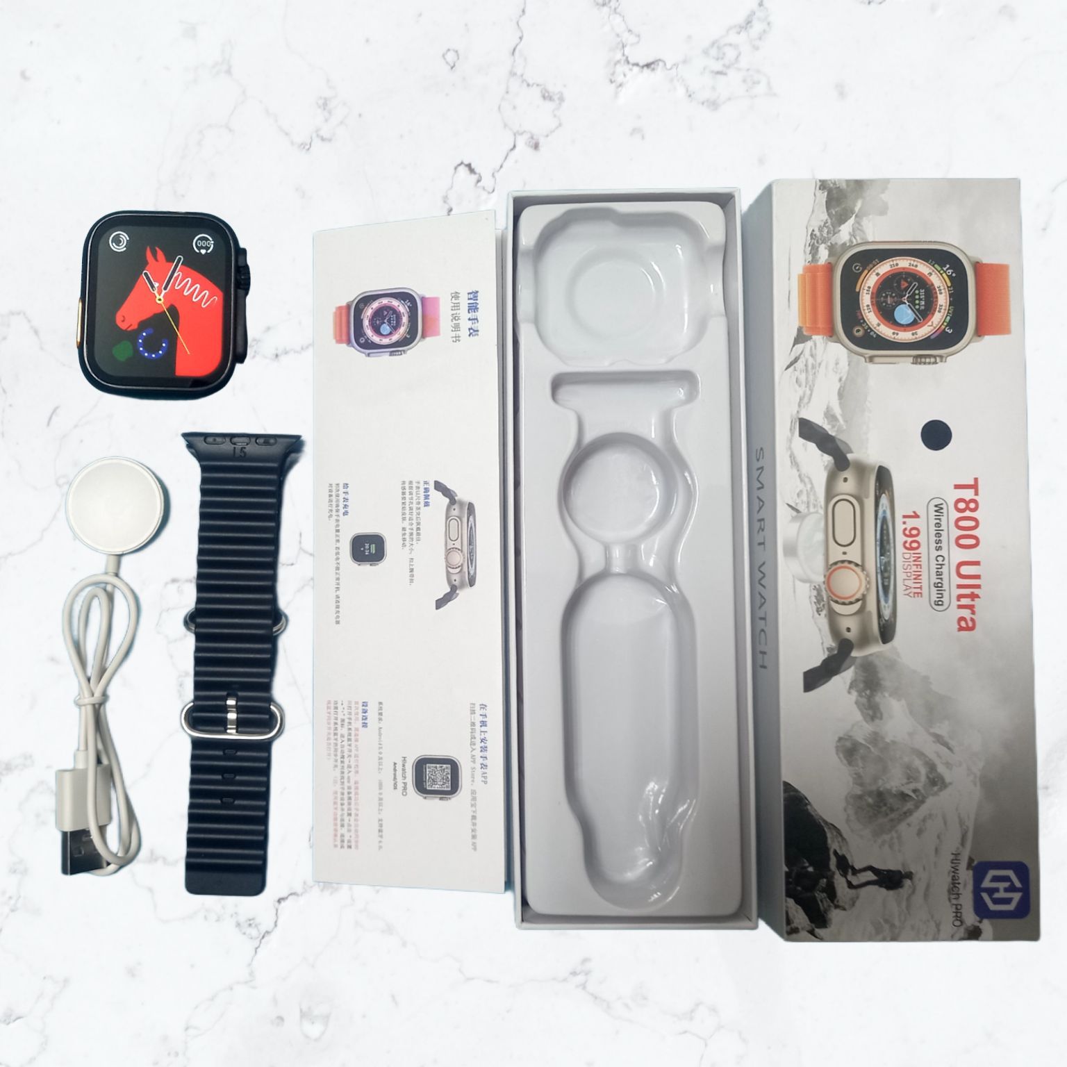 Часы-1шт, силиконовые ремешок-1шт, беспроводное зарядное устройство-1шт, коробка-1шт. инструкция на английском