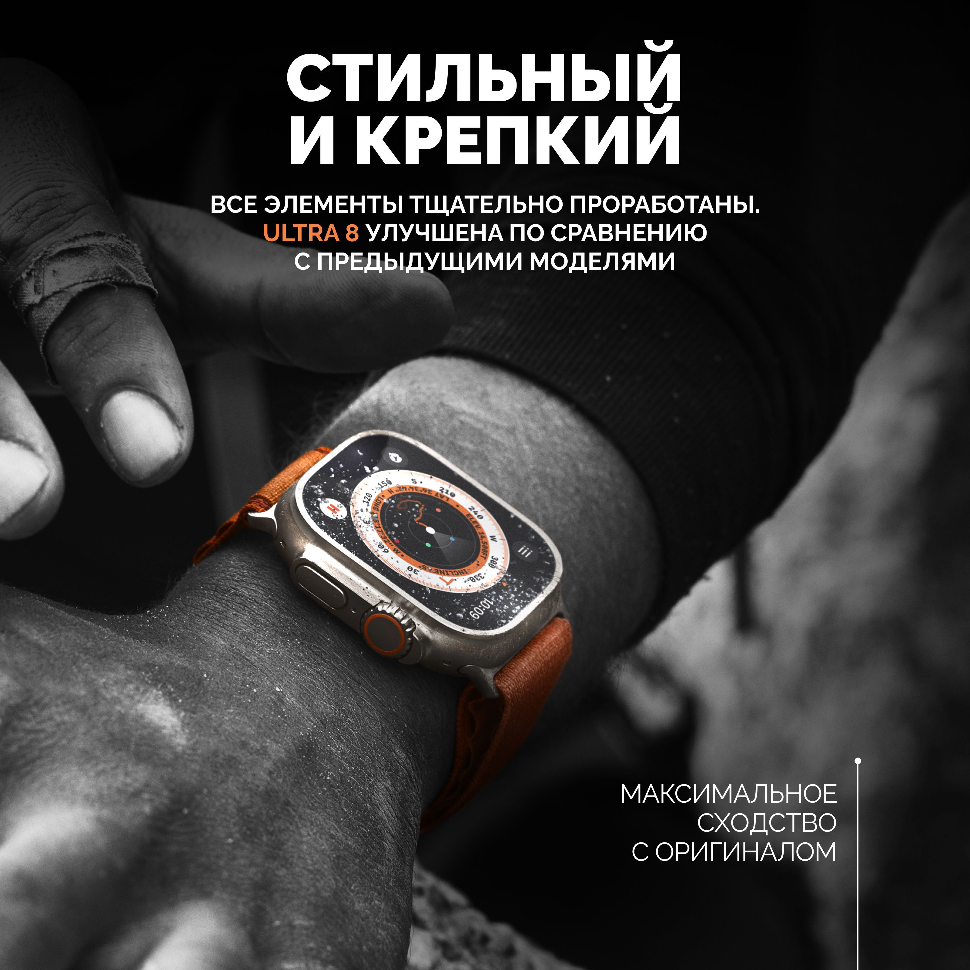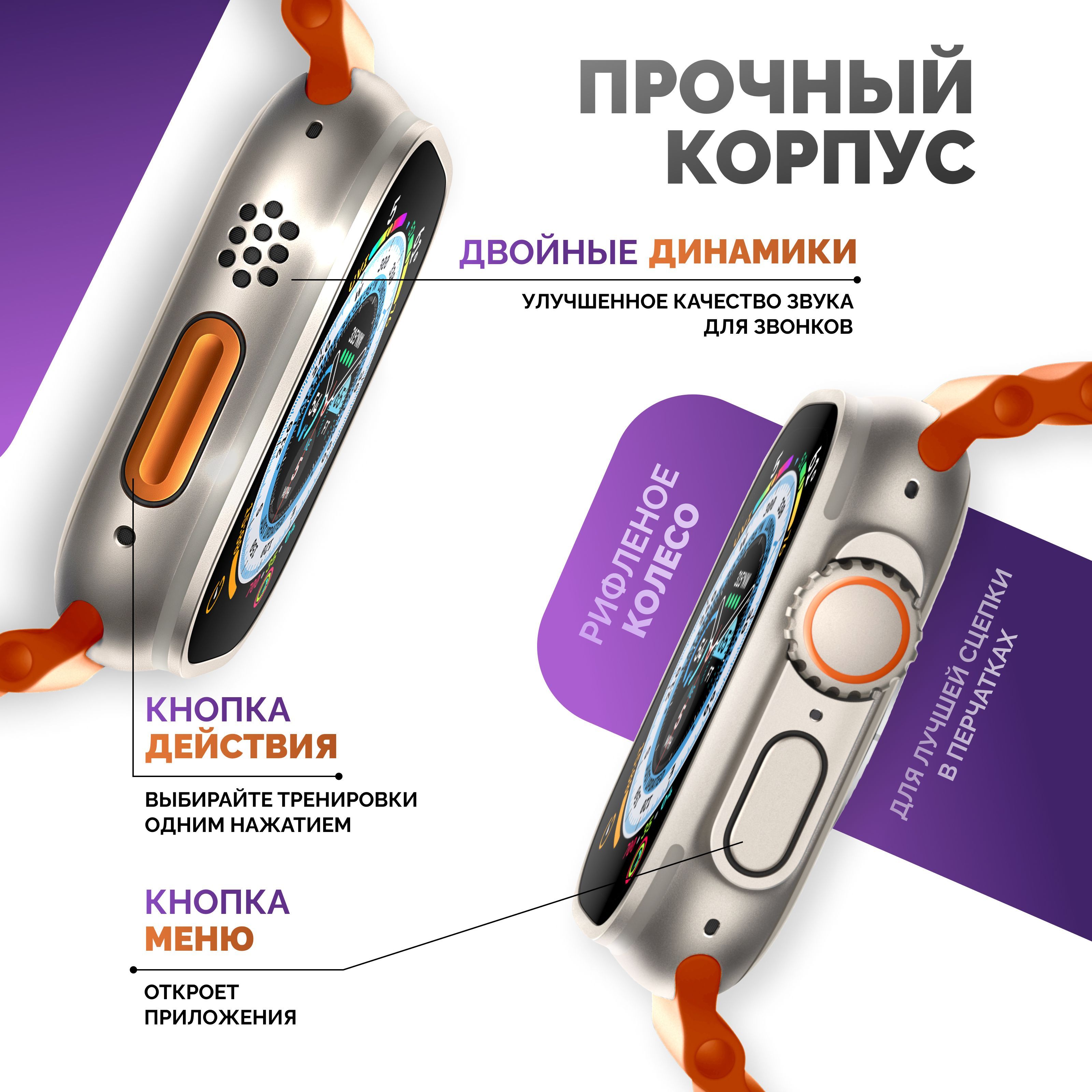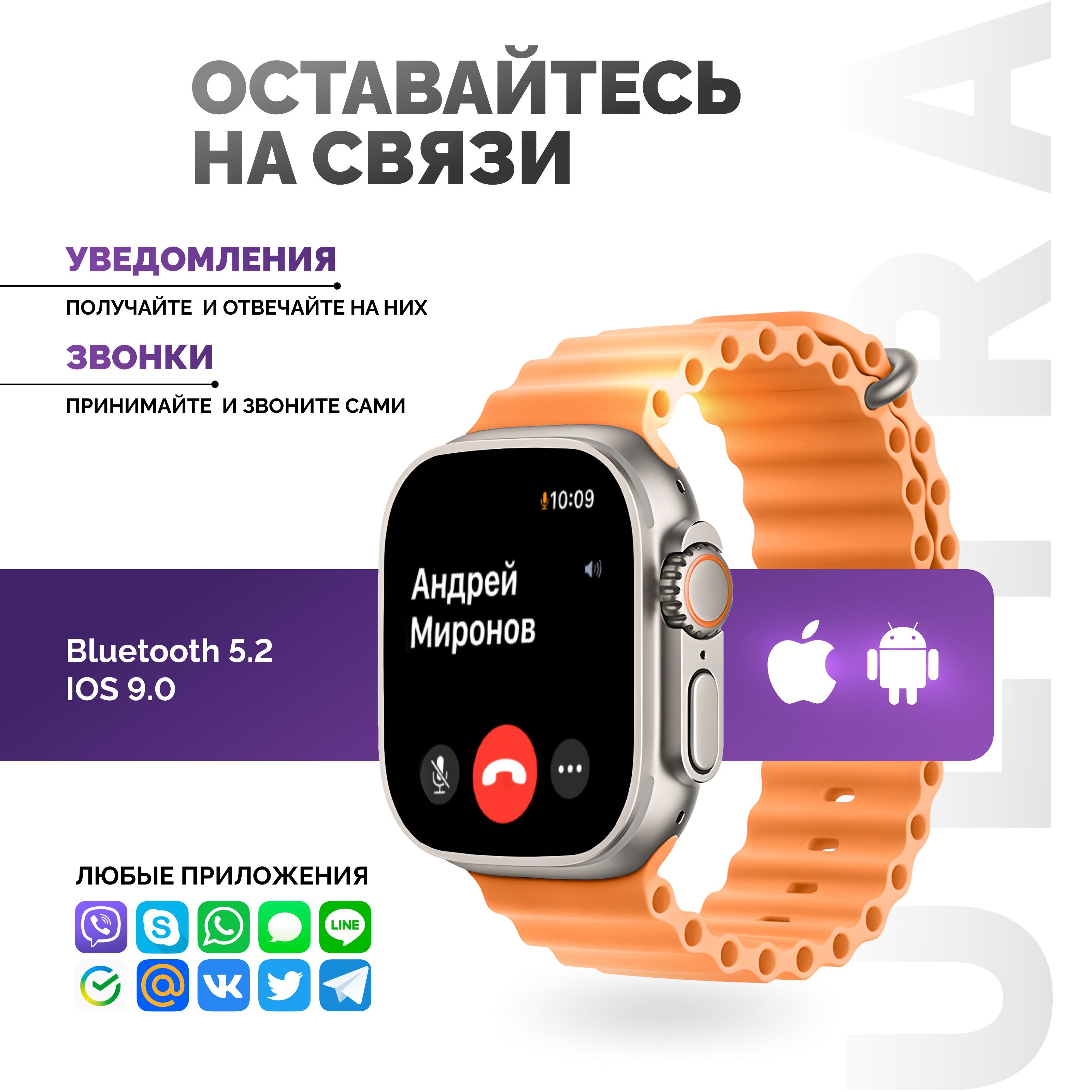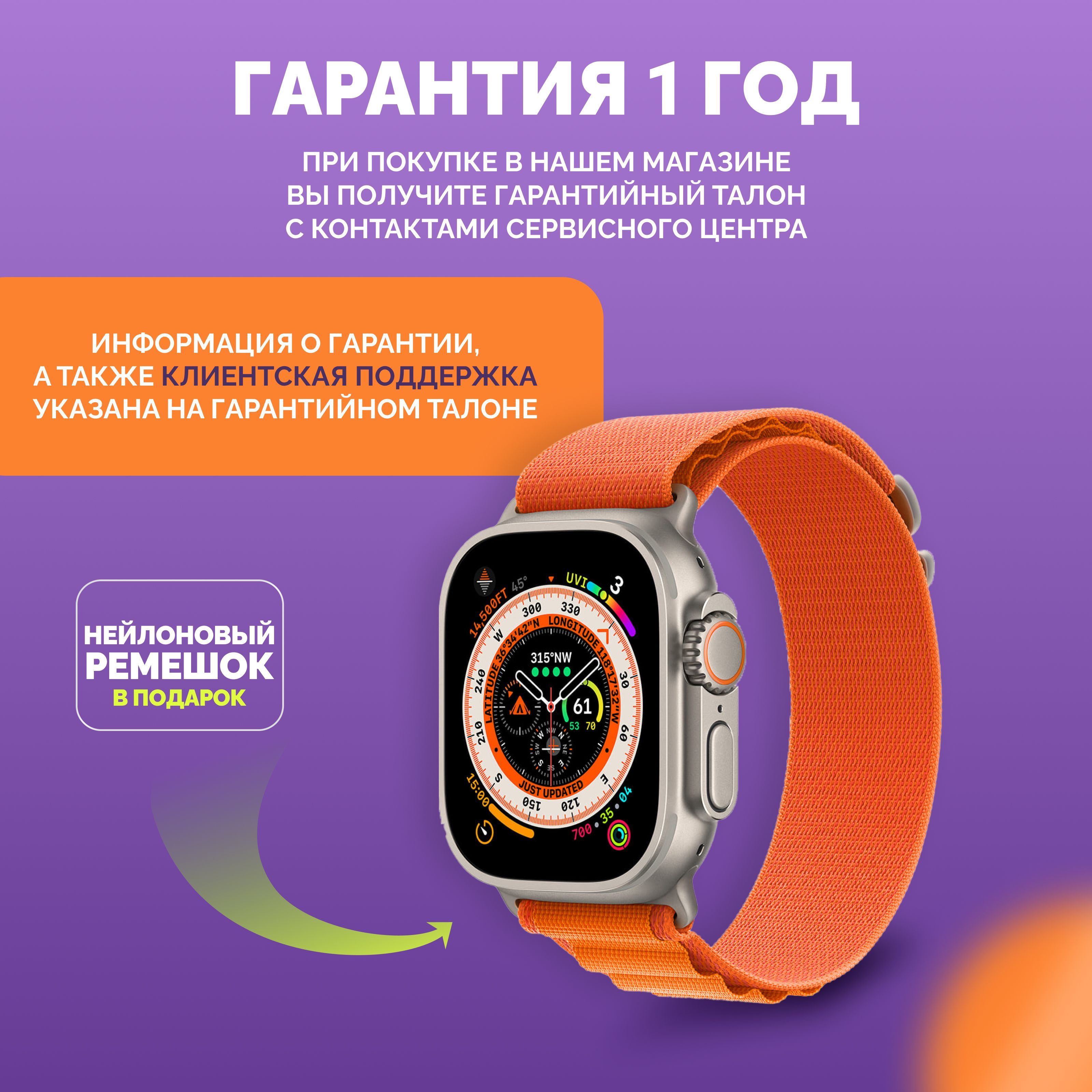 Описание: Смарт-часы серии 8 Ultra - это ультрасовременный гаджет, который предлагает множество функций и возможностей для удобства своих пользователей. Стильный дизайн подчеркнет ваш имидж, а богатый функционал, улучшенный процессор, усиленная батарея и превосходный яркий дисплей сделают эти электронные наручные часы вашим незаменимым помощником на каждый день. Эти умные часы доступны в нескольких расцветках, которые подойдут, как мужчинам, женщинам и подросткам, что делает их идеальным подарком для любого случая - от праздников до повседневных подарков. Смарт-часы серии 8 Ultra имеют закаленное стекло, что делает их очень прочными и устойчивыми к повреждениям. Они оснащены 49 мм безрамочным сенсорным дисплеем на IPS матрице, благодаря чему изображение не гаснет, не искажается и не меняет цвета ни под каким углом. Вы можете менять внешний вид, используя на выбор около 500 вариантов дисплея, которые устанавливаются через приложение. Они также имеют множество функций, которые делают их идеальным выбором для спортсменов и любителей активного образа жизни. Эти умные часы имеют спортивные режимы, которые позволяют пользователям отслеживать свои показатели и результаты во время занятий спортом. Смарт часы имеют защиту от брызг и пыли, но купаться в них не рекомендуем! Большое количество спортивных функций, мульти-спортивный режим позволяют использовать умные часы женские или мужские наручные часы не только как стильный и красивый аксессуар, но и в качестве фитнес часов для мониторинга общего состояния здоровья. Умные часы женские/мужские поддерживают функцию контроля нагрузок при ходьбе, беге, занятиях игровым спортом, езде на велосипеде и т.д. Обращаем внимание, что умные часы не являются поверенным медицинским прибором, поэтому возможны отклонения показателей от действительных. Для точного измерения давления и других показателей пользуйтесь соответствующими медицинскими приборами и обращайтесь к врачам! Но в то же время, вы всегда можете контролировать максимально приближенные результаты измерений, следить за здоровьем. Smart watch series 8 Ultra обладают множеством функций, которые делают их неотъемлемой частью повседневной жизни. Они позволяют пользователям контролировать свои звонки (принимать и совершать), сообщения, уведомления и другие события прямо на своем запястье (либо использовать их через гарнитуру или блютуз наушники). Они также имеют функции музыкального плеера, что позволяет пользователям управлять своей музыкой непосредственно с помощью смарт-часов. Смарт вотч сопрягаются со смартфонами, работающим на операционных системах android и ios. Достаточно скачать бесплатное приложение WearfitPro или Wear Pro (в зависимости от поставки и инструкции к часам), включить Bluetooth и следовать строго той схеме по подключению, что указана в инструкции, идущей вместе с часами. Одним из главных преимуществ смарт-часов серии 8 Ultra является их стильный и современный дизайн. Они доступны в разных цветах и вариантах, что делает их идеальным выбором для любого стиля и вкуса. Эти умные наручные часы имеют яркий и крупный дисплей, который можно настроить на разные цветовые схемы и темы. Мягкий рифленый ремешок из гипоаллергенного силикона приятно облегает запястье, благодаря чему смарт часы 8 серии практически не чувствуются на руке. На данные часы подхо