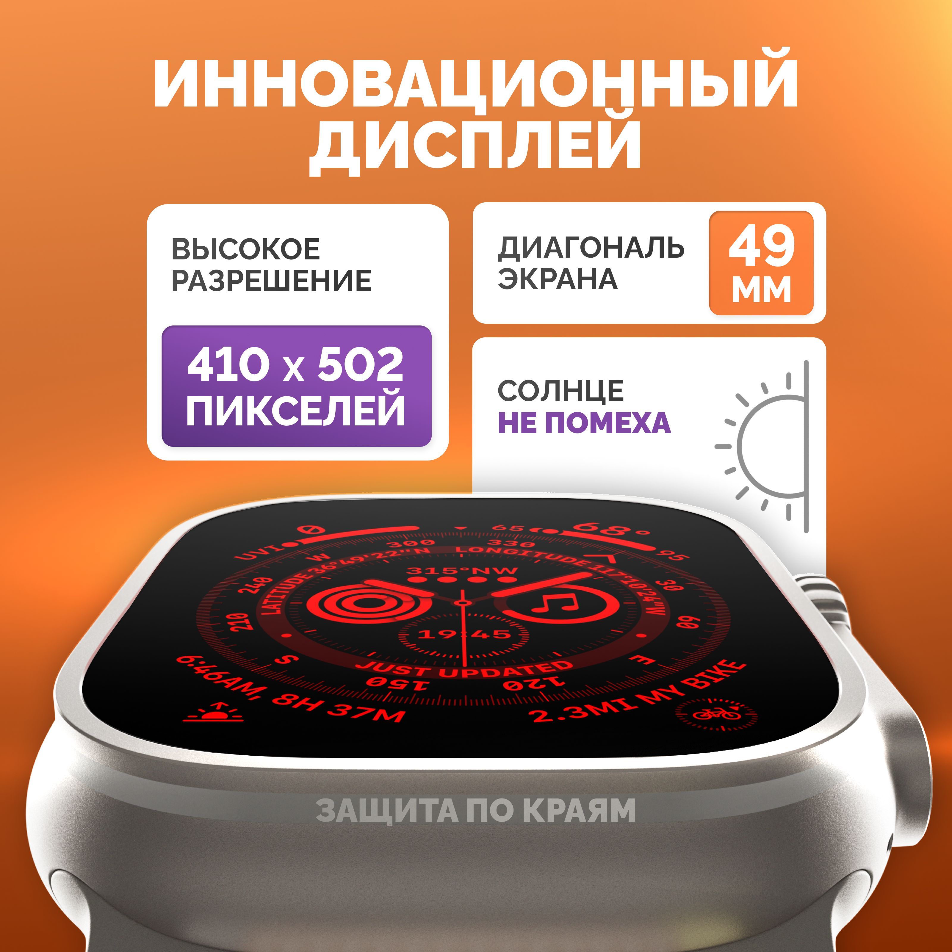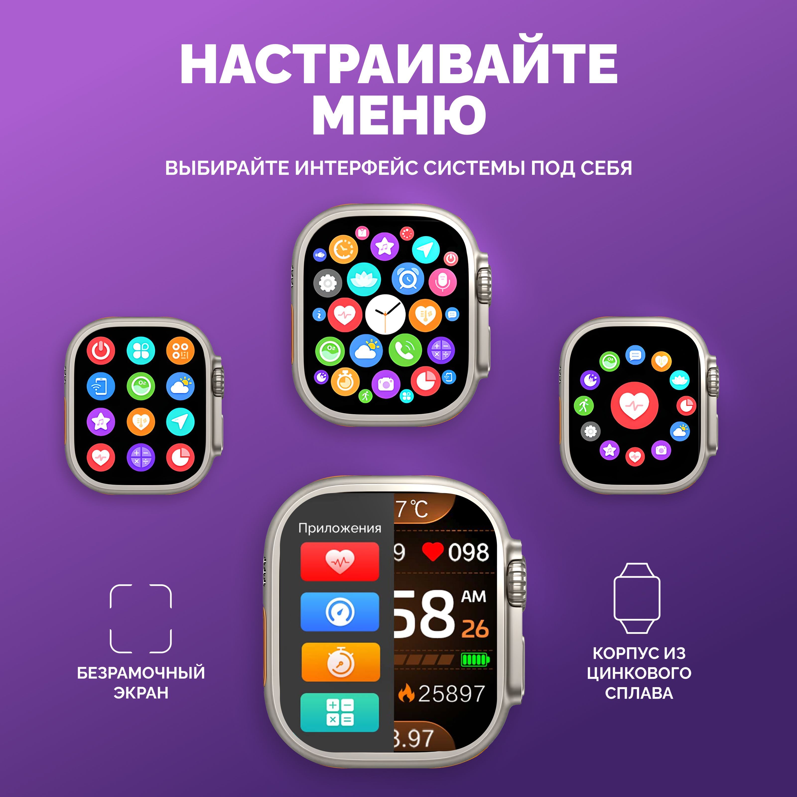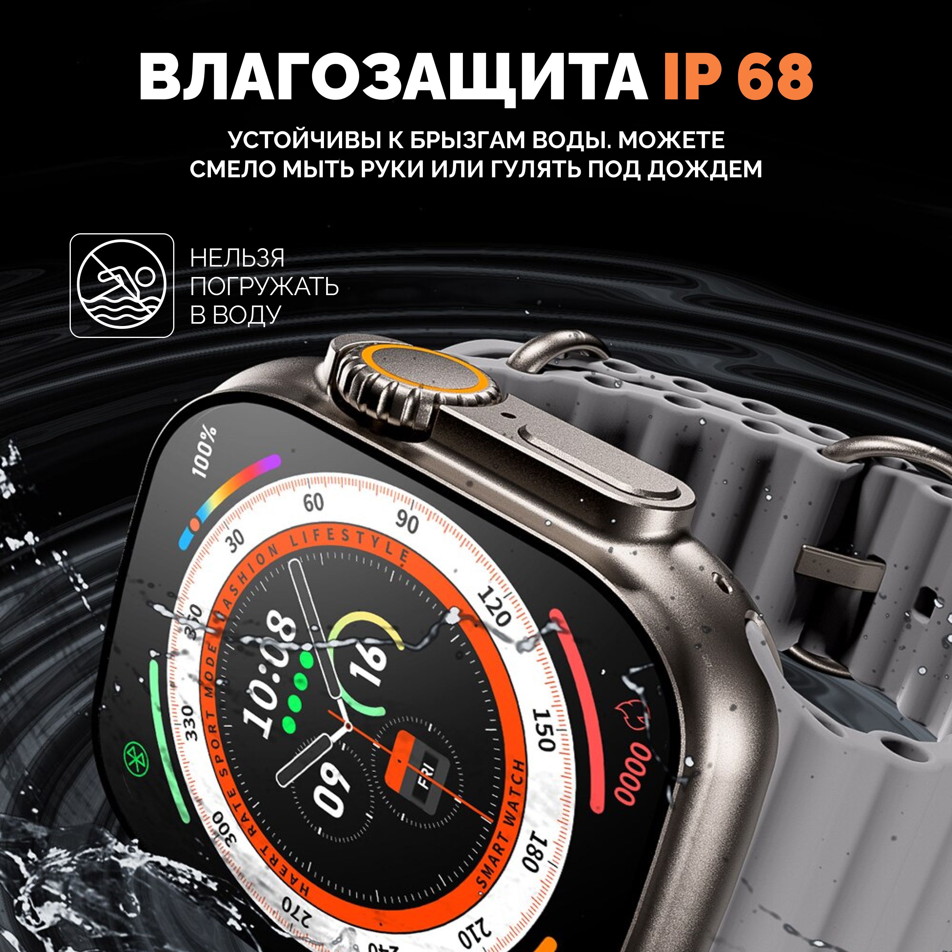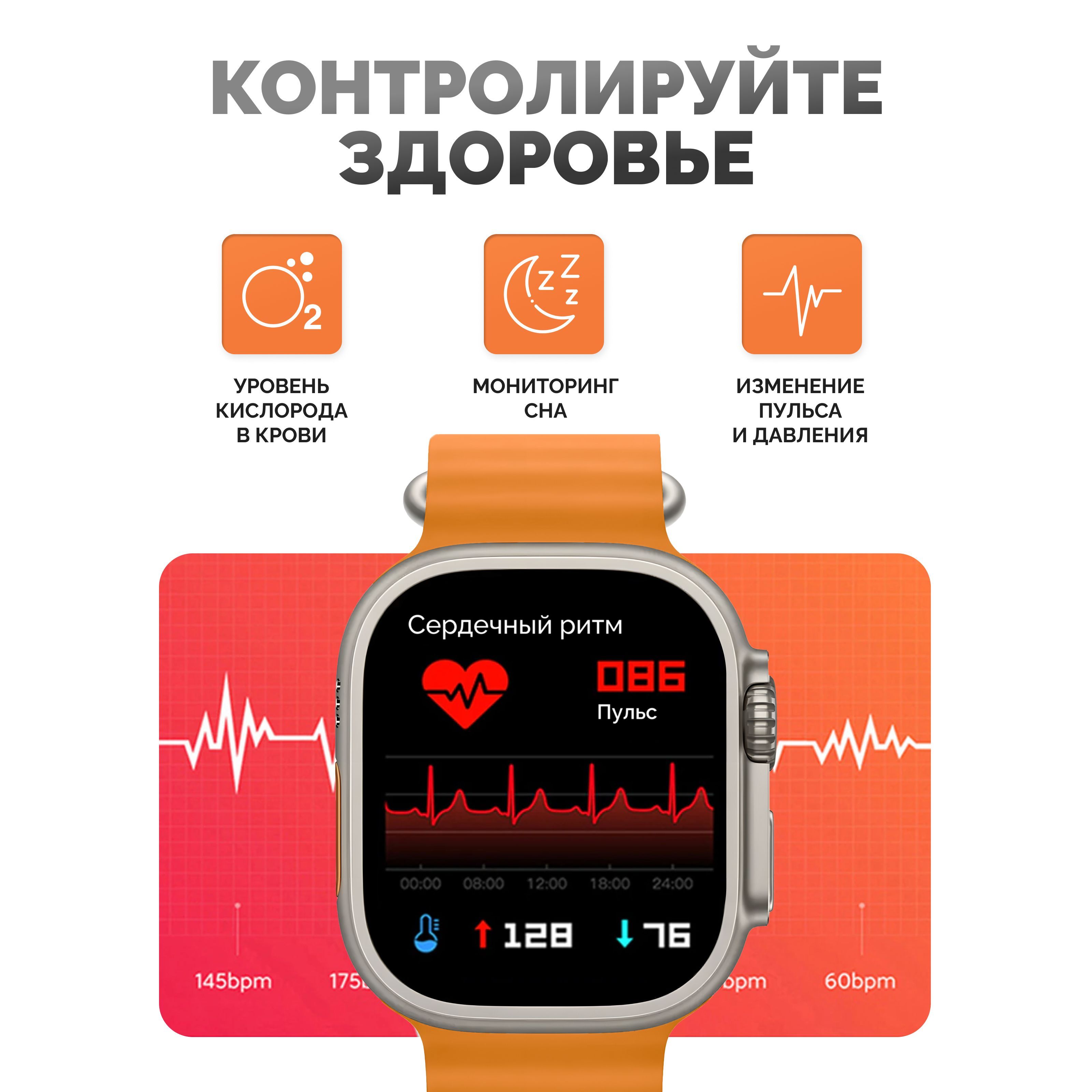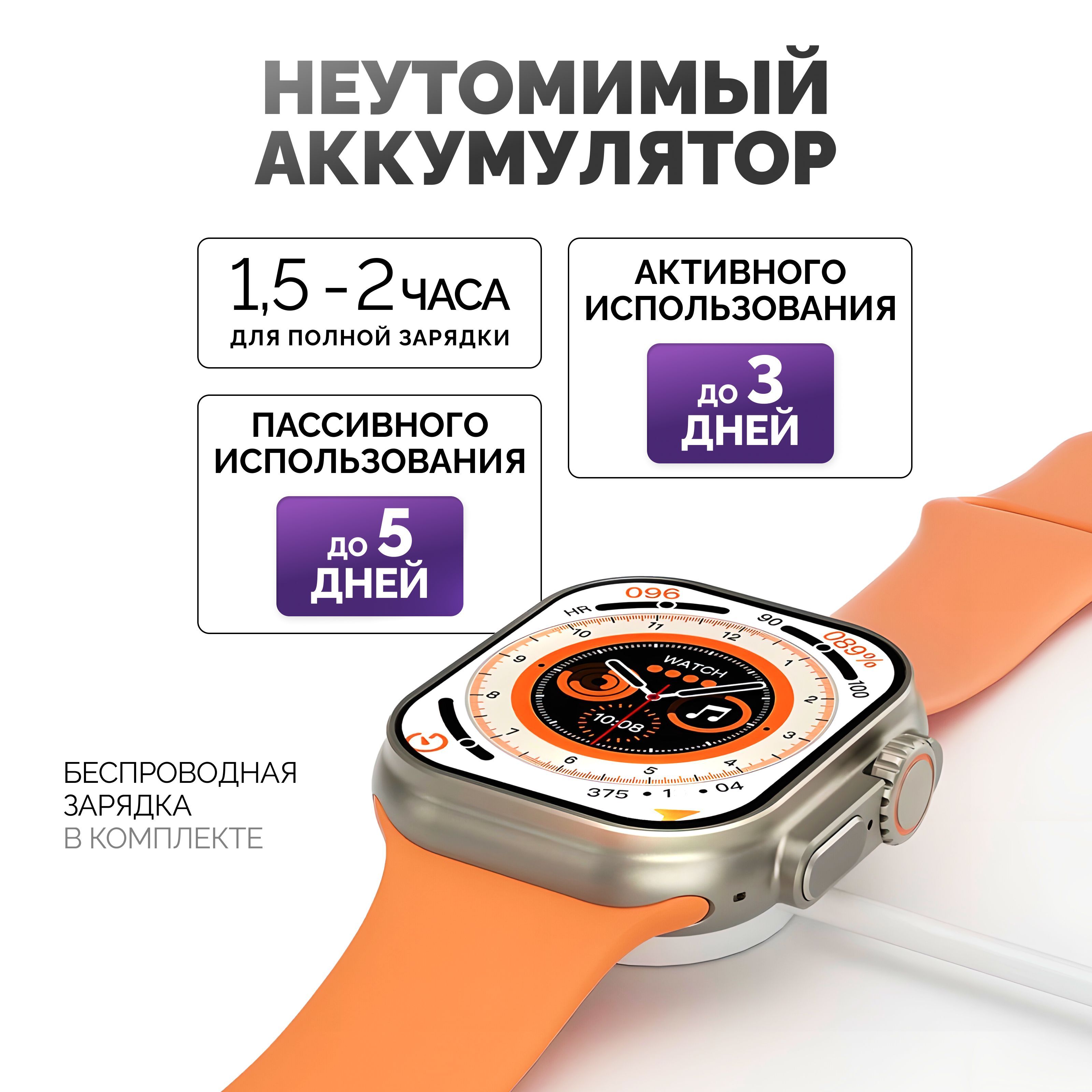 Описание: Смарт-часы серии 8 Ultra - это ультрасовременный гаджет, который предлагает множество функций и возможностей для удобства своих пользователей. Стильный дизайн подчеркнет ваш имидж, а богатый функционал, улучшенный процессор, усиленная батарея и превосходный яркий дисплей сделают эти электронные наручные часы вашим незаменимым помощником на каждый день. Эти умные часы доступны в нескольких расцветках, которые подойдут, как мужчинам, женщинам и подросткам, что делает их идеальным подарком для любого случая - от праздников до повседневных подарков. Смарт-часы серии 8 Ultra имеют закаленное стекло, что делает их очень прочными и устойчивыми к повреждениям. Они оснащены 49 мм безрамочным сенсорным дисплеем на IPS матрице, благодаря чему изображение не гаснет, не искажается и не меняет цвета ни под каким углом. Вы можете менять внешний вид, используя на выбор около 500 вариантов дисплея, которые устанавливаются через приложение. Они также имеют множество функций, которые делают их идеальным выбором для спортсменов и любителей активного образа жизни. Эти умные часы имеют спортивные режимы, которые позволяют пользователям отслеживать свои показатели и результаты во время занятий спортом. Смарт часы имеют защиту от брызг и пыли, но купаться в них не рекомендуем! Большое количество спортивных функций, мульти-спортивный режим позволяют использовать умные часы женские или мужские наручные часы не только как стильный и красивый аксессуар, но и в качестве фитнес часов для мониторинга общего состояния здоровья. Умные часы женские/мужские поддерживают функцию контроля нагрузок при ходьбе, беге, занятиях игровым спортом, езде на велосипеде и т.д. Обращаем внимание, что умные часы не являются поверенным медицинским прибором, поэтому возможны отклонения показателей от действительных. Для точного измерения давления и других показателей пользуйтесь соответствующими медицинскими приборами и обращайтесь к врачам! Но в то же время, вы всегда можете контролировать максимально приближенные результаты измерений, следить за здоровьем. Smart watch series 8 Ultra обладают множеством функций, которые делают их неотъемлемой частью повседневной жизни. Они позволяют пользователям контролировать свои звонки (принимать и совершать), сообщения, уведомления и другие события прямо на своем запястье (либо использовать их через гарнитуру или блютуз наушники). Они также имеют функции музыкального плеера, что позволяет пользователям управлять своей музыкой непосредственно с помощью смарт-часов. Смарт вотч сопрягаются со смартфонами, работающим на операционных системах android и ios. Достаточно скачать бесплатное приложение WearfitPro или Wear Pro (в зависимости от поставки и инструкции к часам), включить Bluetooth и следовать строго той схеме по подключению, что указана в инструкции, идущей вместе с часами. Одним из главных преимуществ смарт-часов серии 8 Ultra является их стильный и современный дизайн. Они доступны в разных цветах и вариантах, что делает их идеальным выбором для любого стиля и вкуса. Эти умные наручные часы имеют яркий и крупный дисплей, который можно настроить на разные цветовые схемы и темы. Мягкий рифленый ремешок из гипоаллергенного силикона приятно облегает запястье, благодаря чему смарт часы 8 серии практически не чувствуются на руке. На данные часы подхо