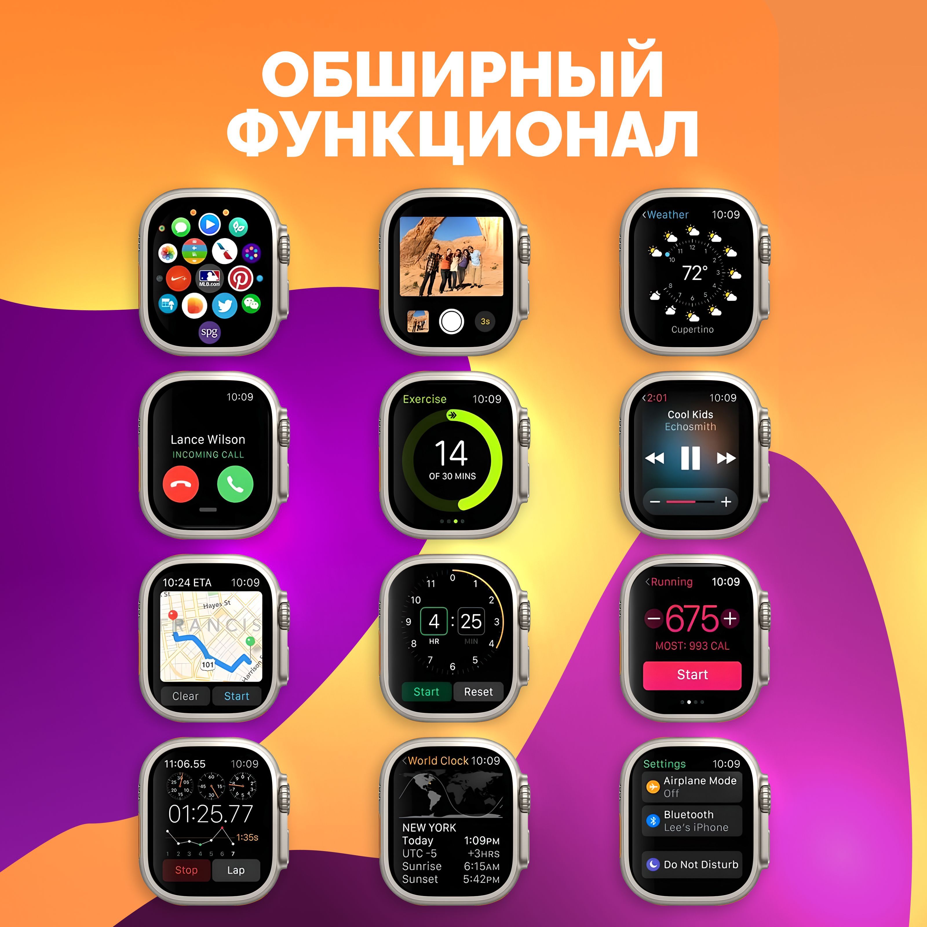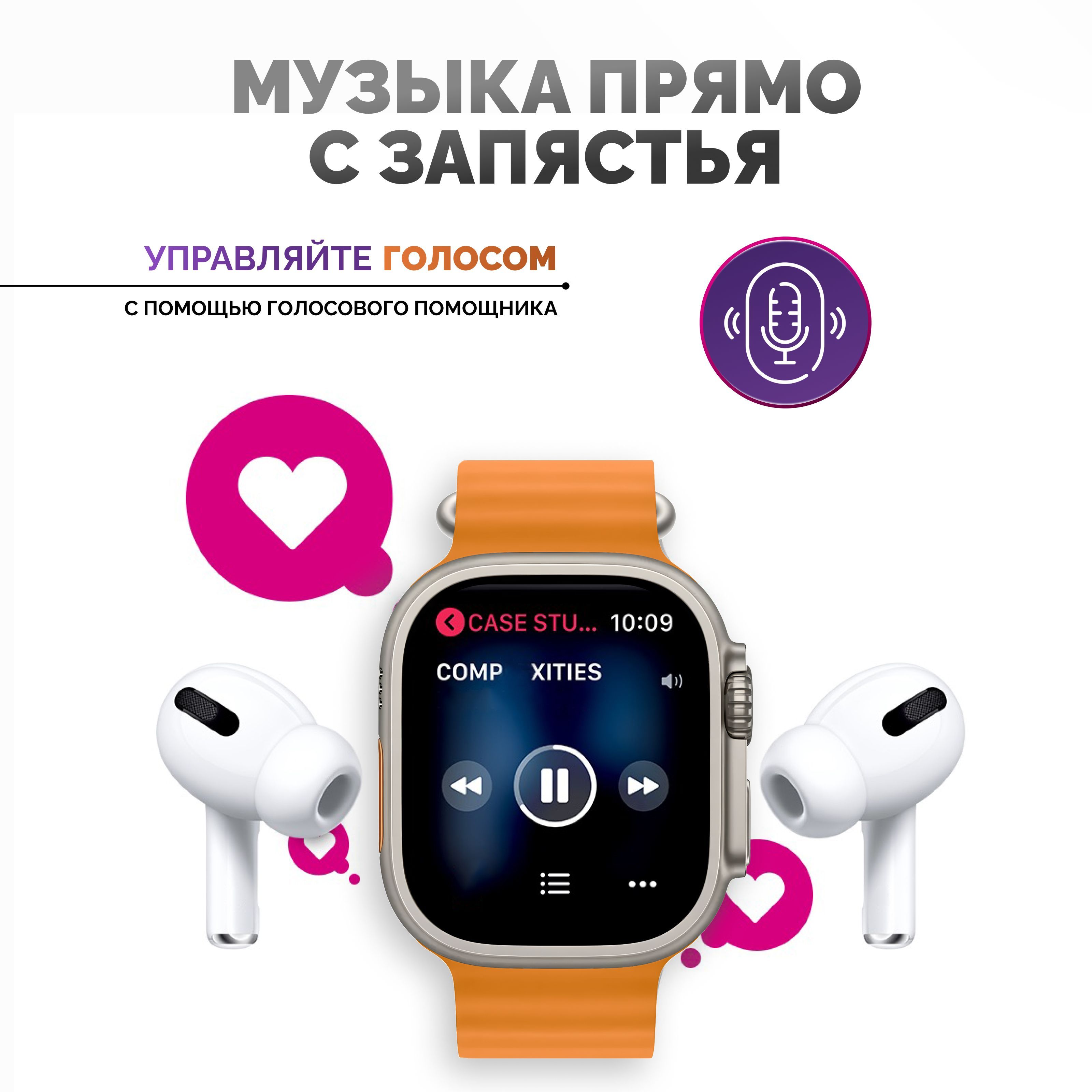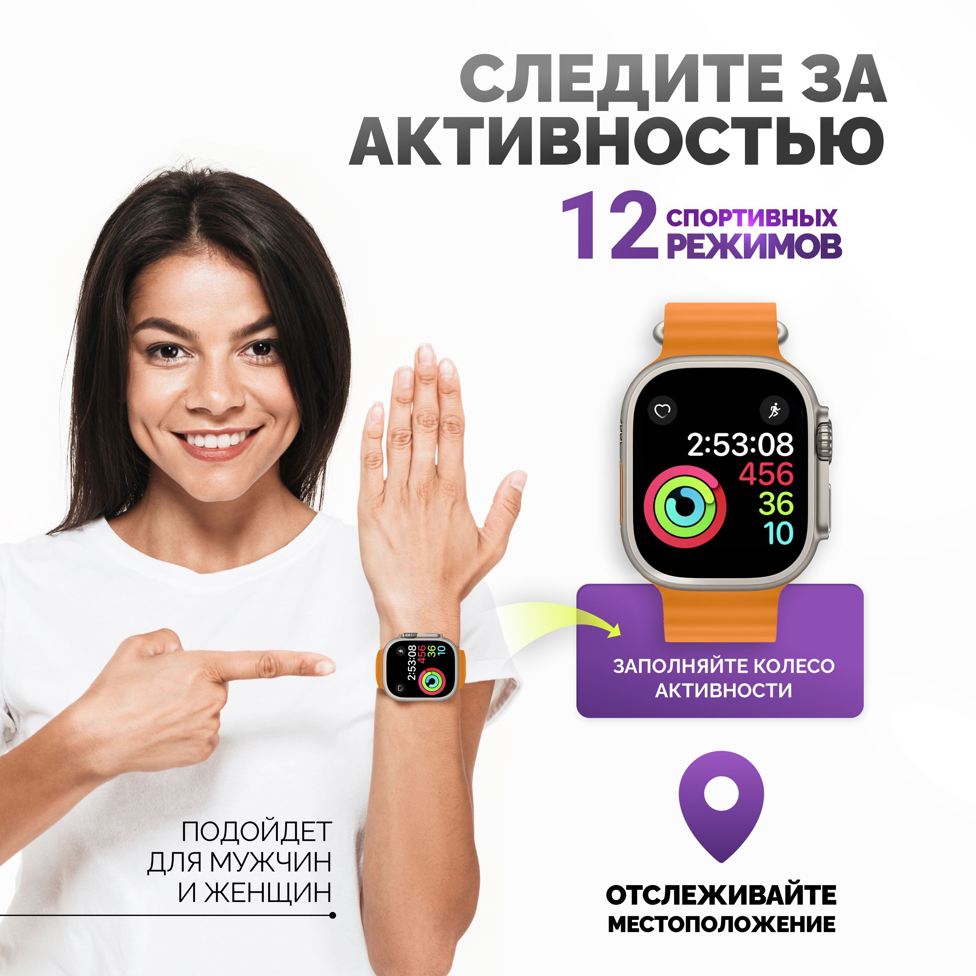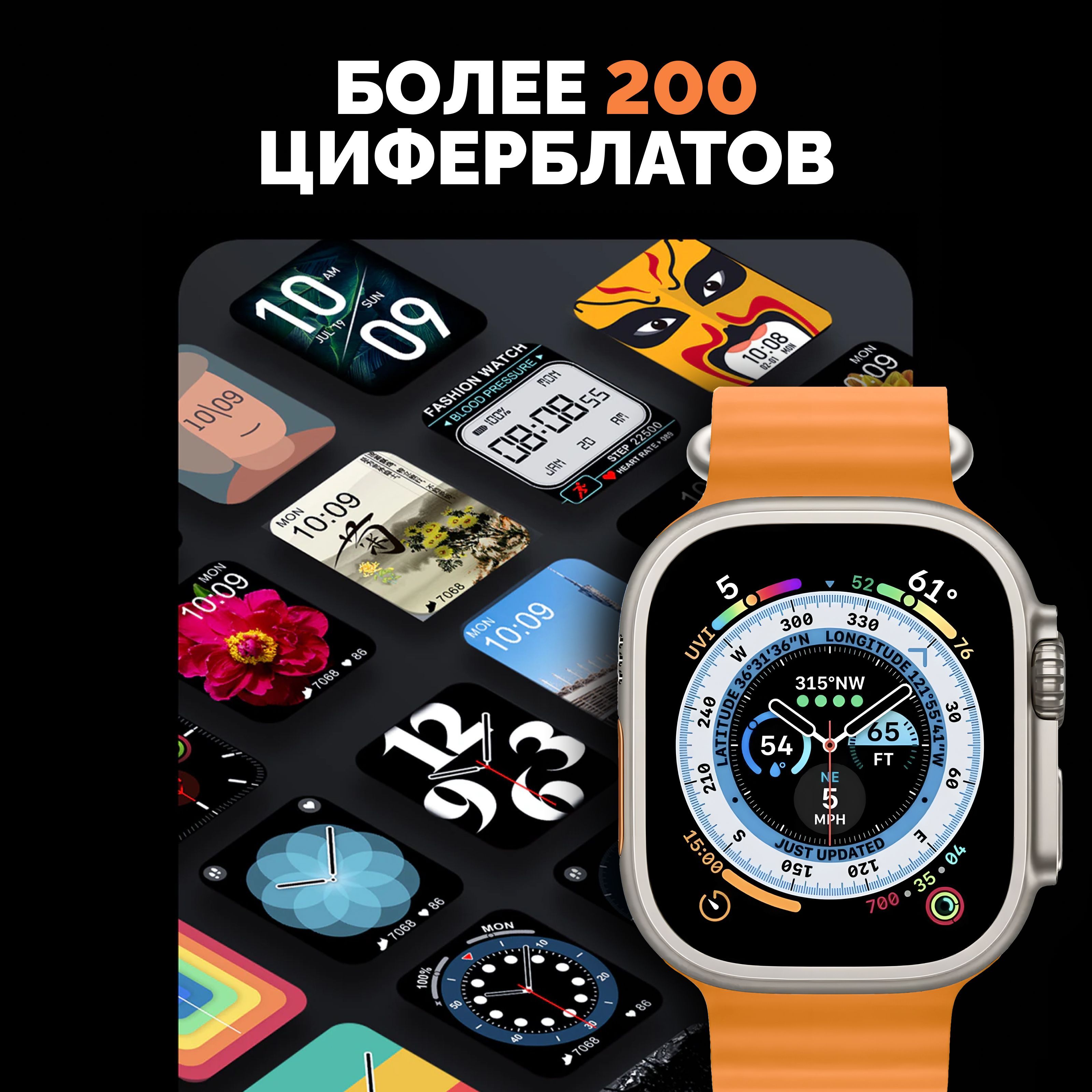 Описание: Смарт-часы серии 8 Ultra - это ультрасовременный гаджет, который предлагает множество функций и возможностей для удобства своих пользователей. Стильный дизайн подчеркнет ваш имидж, а богатый функционал, улучшенный процессор, усиленная батарея и превосходный яркий дисплей сделают эти электронные наручные часы вашим незаменимым помощником на каждый день. Эти умные часы доступны в нескольких расцветках, которые подойдут, как мужчинам, женщинам и подросткам, что делает их идеальным подарком для любого случая - от праздников до повседневных подарков. Смарт-часы серии 8 Ultra имеют закаленное стекло, что делает их очень прочными и устойчивыми к повреждениям. Они оснащены 49 мм безрамочным сенсорным дисплеем на IPS матрице, благодаря чему изображение не гаснет, не искажается и не меняет цвета ни под каким углом. Вы можете менять внешний вид, используя на выбор около 500 вариантов дисплея, которые устанавливаются через приложение. Они также имеют множество функций, которые делают их идеальным выбором для спортсменов и любителей активного образа жизни. Эти умные часы имеют спортивные режимы, которые позволяют пользователям отслеживать свои показатели и результаты во время занятий спортом. Смарт часы имеют защиту от брызг и пыли, но купаться в них не рекомендуем! Большое количество спортивных функций, мульти-спортивный режим позволяют использовать умные часы женские или мужские наручные часы не только как стильный и красивый аксессуар, но и в качестве фитнес часов для мониторинга общего состояния здоровья. Умные часы женские/мужские поддерживают функцию контроля нагрузок при ходьбе, беге, занятиях игровым спортом, езде на велосипеде и т.д. Обращаем внимание, что умные часы не являются поверенным медицинским прибором, поэтому возможны отклонения показателей от действительных. Для точного измерения давления и других показателей пользуйтесь соответствующими медицинскими приборами и обращайтесь к врачам! Но в то же время, вы всегда можете контролировать максимально приближенные результаты измерений, следить за здоровьем. Smart watch series 8 Ultra обладают множеством функций, которые делают их неотъемлемой частью повседневной жизни. Они позволяют пользователям контролировать свои звонки (принимать и совершать), сообщения, уведомления и другие события прямо на своем запястье (либо использовать их через гарнитуру или блютуз наушники). Они также имеют функции музыкального плеера, что позволяет пользователям управлять своей музыкой непосредственно с помощью смарт-часов. Смарт вотч сопрягаются со смартфонами, работающим на операционных системах android и ios. Достаточно скачать бесплатное приложение WearfitPro или Wear Pro (в зависимости от поставки и инструкции к часам), включить Bluetooth и следовать строго той схеме по подключению, что указана в инструкции, идущей вместе с часами. Одним из главных преимуществ смарт-часов серии 8 Ultra является их стильный и современный дизайн. Они доступны в разных цветах и вариантах, что делает их идеальным выбором для любого стиля и вкуса. Эти умные наручные часы имеют яркий и крупный дисплей, который можно настроить на разные цветовые схемы и темы. Мягкий рифленый ремешок из гипоаллергенного силикона приятно облегает запястье, благодаря чему смарт часы 8 серии практически не чувствуются на руке. На данные часы подхо