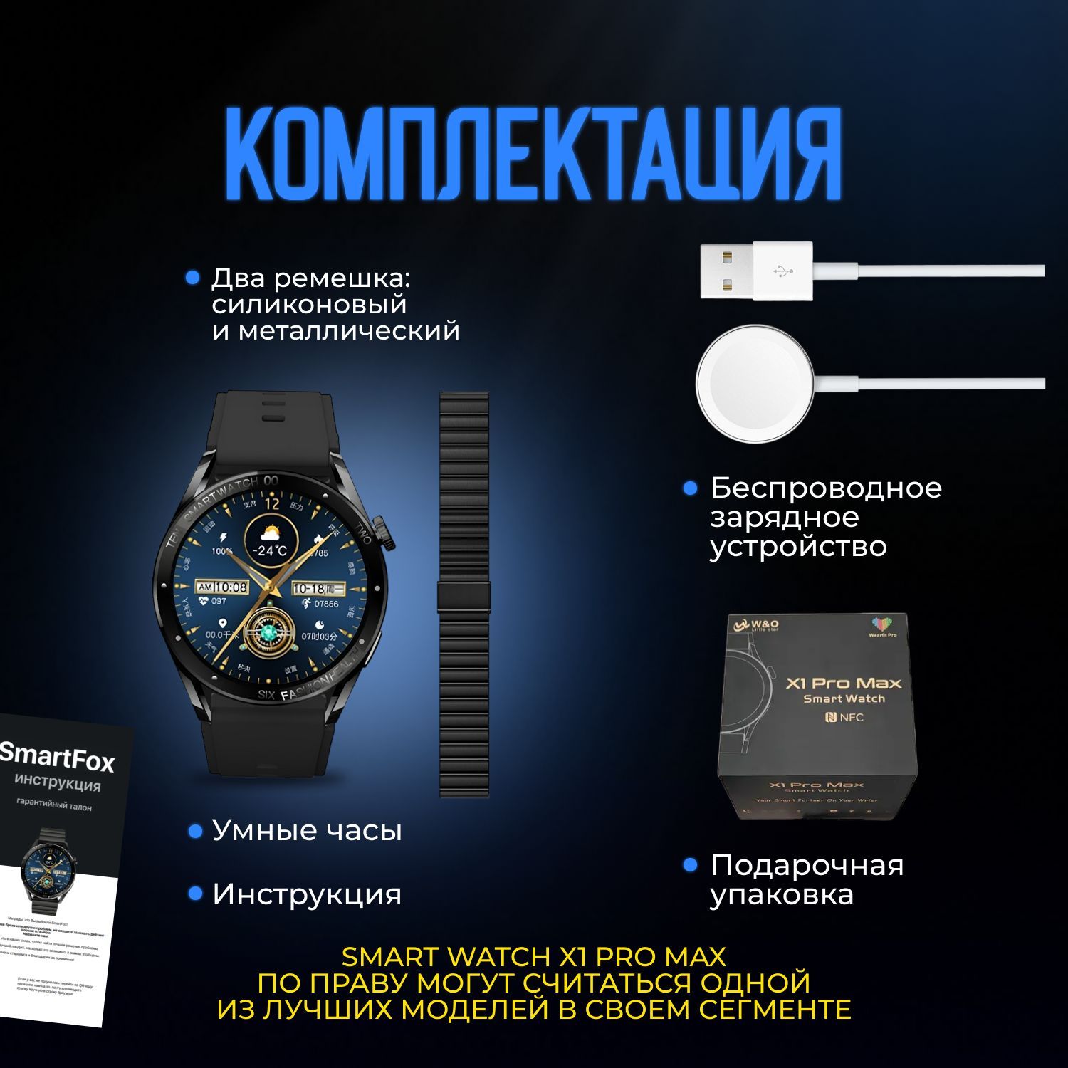 Смарт часы X1 Pro Max - 1 шт; Ремешок металлический - 1 шт; Ремешок силиконовый - 1 шт; беспроводная зарядка - 1 шт; Инструкция - 1 шт.