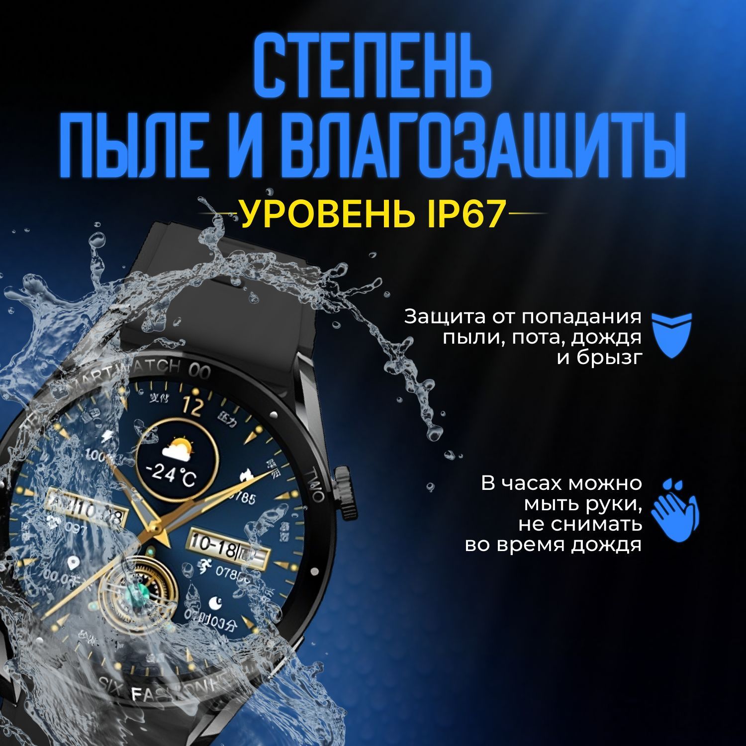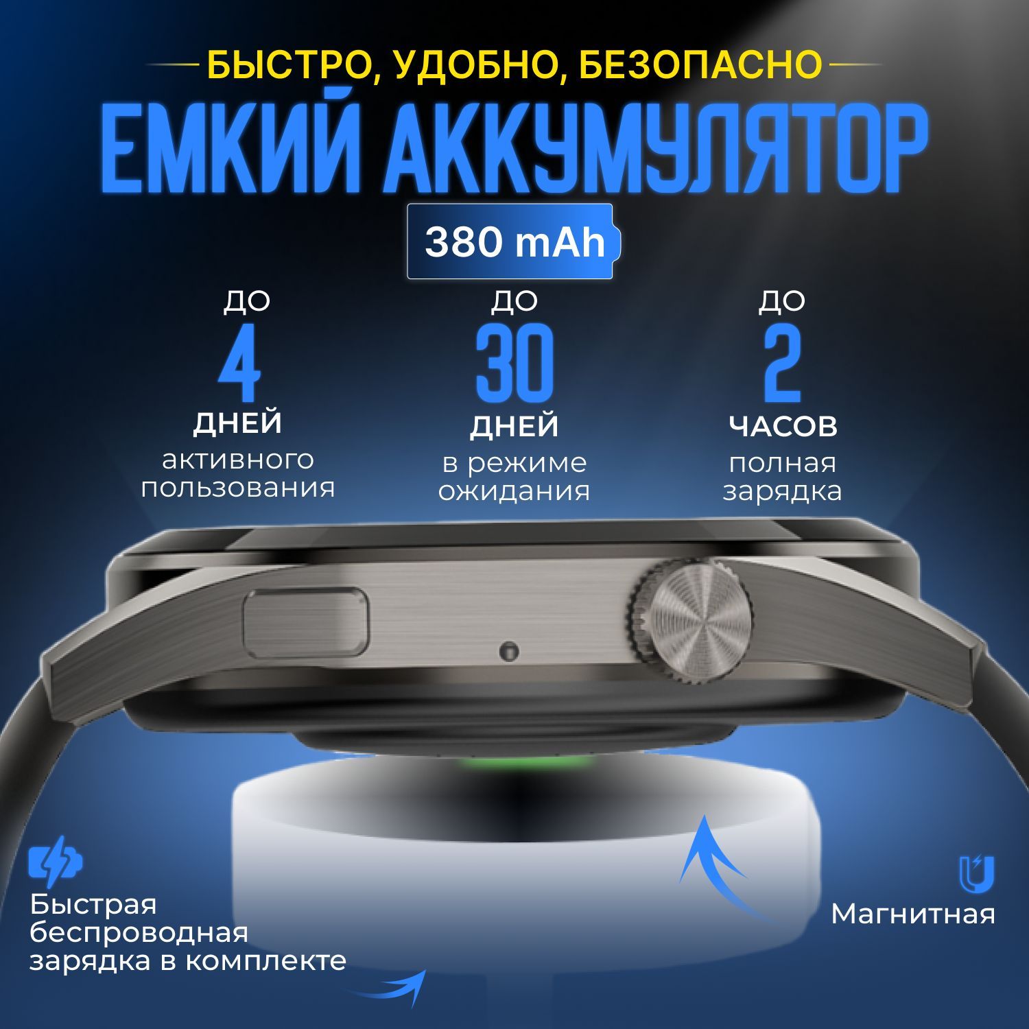 Описание: Умные наручные смарт-часы от SmartFox - это современный электронный гаджет, для мужчин, который может использоваться как классический аксессуар для определения времени, а также как полезный многофункциональный браслет. С его помощью Вы можете: принимать звонки и уведомления текстовых сообщений из СМС, мессенджеров, социальных сетей, от приложений, мониторить собственную активность, управлять музыкальным плеером, пользоваться голосовыми помощниками Siri и Алиса, просматривать погоду, считать в калькуляторе, работать с уведомлениями, вовремя просыпаться по будильнику, управлять камерой на смартфоне и многое другое! Стильный безрамочный сенсорный экран с высоким разрешением и ярким изображением, интуитивное управление с помощью боковой кнопки и колеса, мощный процессор для быстрой загрузки данных и реакции устройства, микрофон и динамик. Круглые смарт часы подойдут спортсменам и посетителям фитнес клубов. В спортзале Вы можете выбрать тренировку, засекать время на секундомере, переключить песню в спортзале, подсчитывать шаги, отслеживать пульс, фазы сна дома. Согласитесь, это удобно и позволяет внимательно заниматься своим здоровьем и психическим, ментальным состоянием. Наши круглые смарт часы выпускаются в популярных оригинальных цветах: серебристый и черный. В комплекте умных часов мужских круглых 2 ремешка с регулировкой размера по запястью: классический (металлический) и спортивный (силиконовый). В качестве дополнения - есть возможность установить собственное изображение. Вы можете выбрать подходящий оттенок и ремень для создания образа - повседневный, деловой, спортивный дизайн. Подключение осуществляется через Bluetooth 5.0. Часы watch Pro имеют время работы в автономном режиме около 96 часов (4 дня) в зависимости от активности использования. Пиковая производительность достигается после 7 полных циклов зарядки. Внутри есть NFC сканер. На территории России на данный момент он не работает. Устройство (смарт часы круглые спортивные) работает без сим карты. Обновление прошивки производится через сеть интернет, без особых усилий. Наши умные часы имеют следующую комплектацию: гарантийный талон, он же инструкция на русском языке, 2 ремешка (основной и запасной), беспроводная зарядка. В компании SmartFox существует служба контроля качества и отдел сопровождения клиентов. Вы всегда можете связаться с технической поддержкой по всем вопросам, контакты указаны в инструкции к товару. Гарантия 6 месяцев со дня покупки. Водонепроницаемые smart вотч не являются медицинским прибором и могут иметь погрешности в измерениях показателей здоровья.