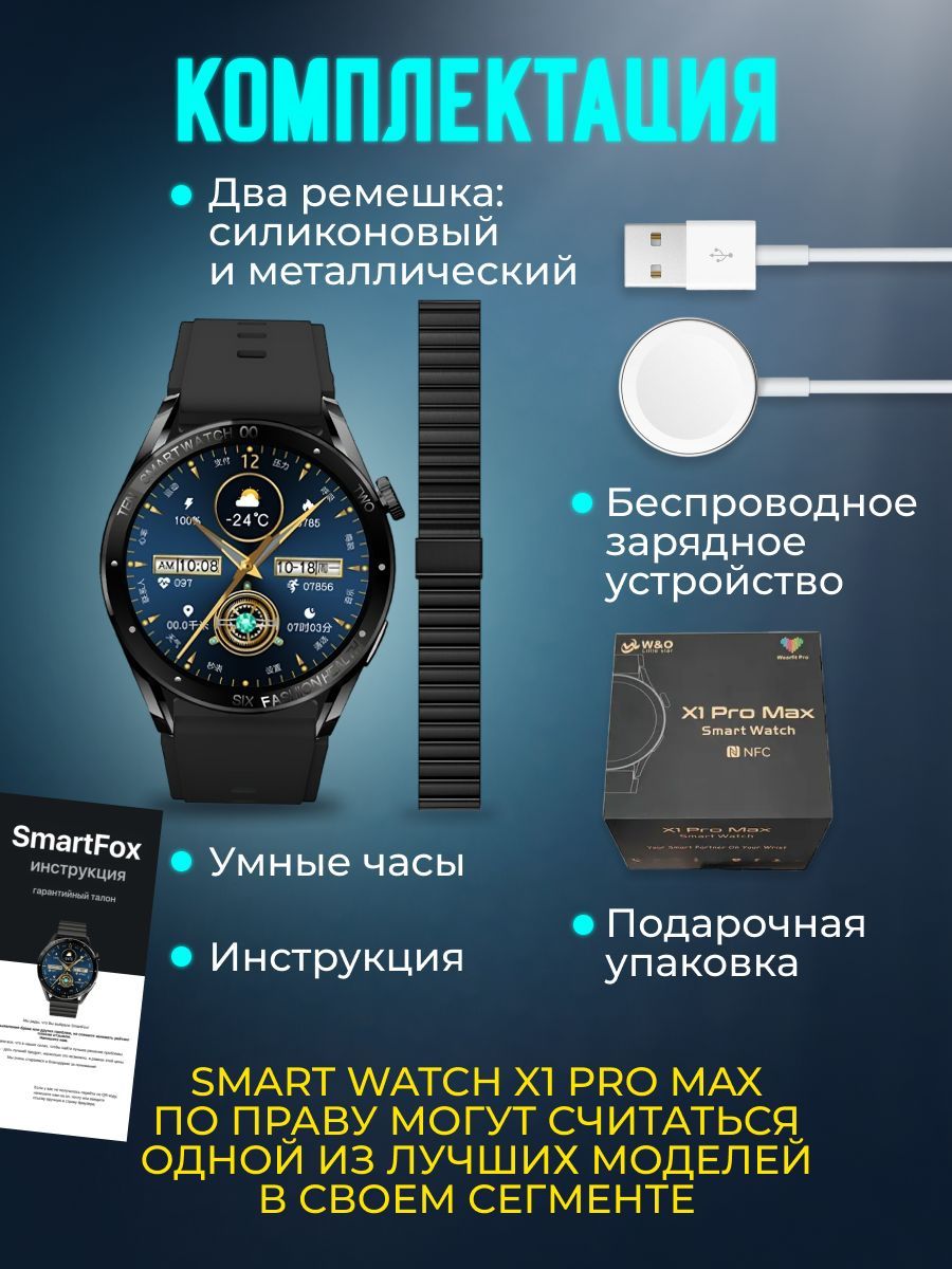 Смарт часы X1 Pro Max - 1 шт; Ремешок металлический - 1 шт; Ремешок силиконовый - 1 шт; беспроводная зарядка - 1 шт; Инструкция - 1 шт.