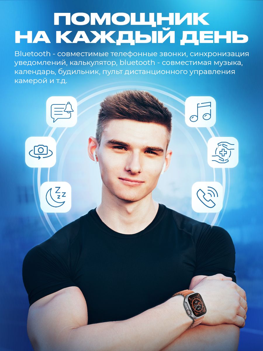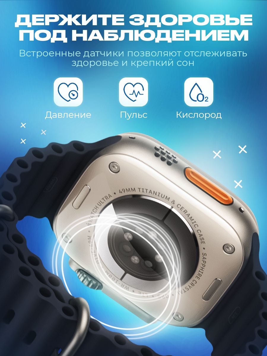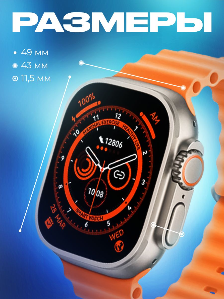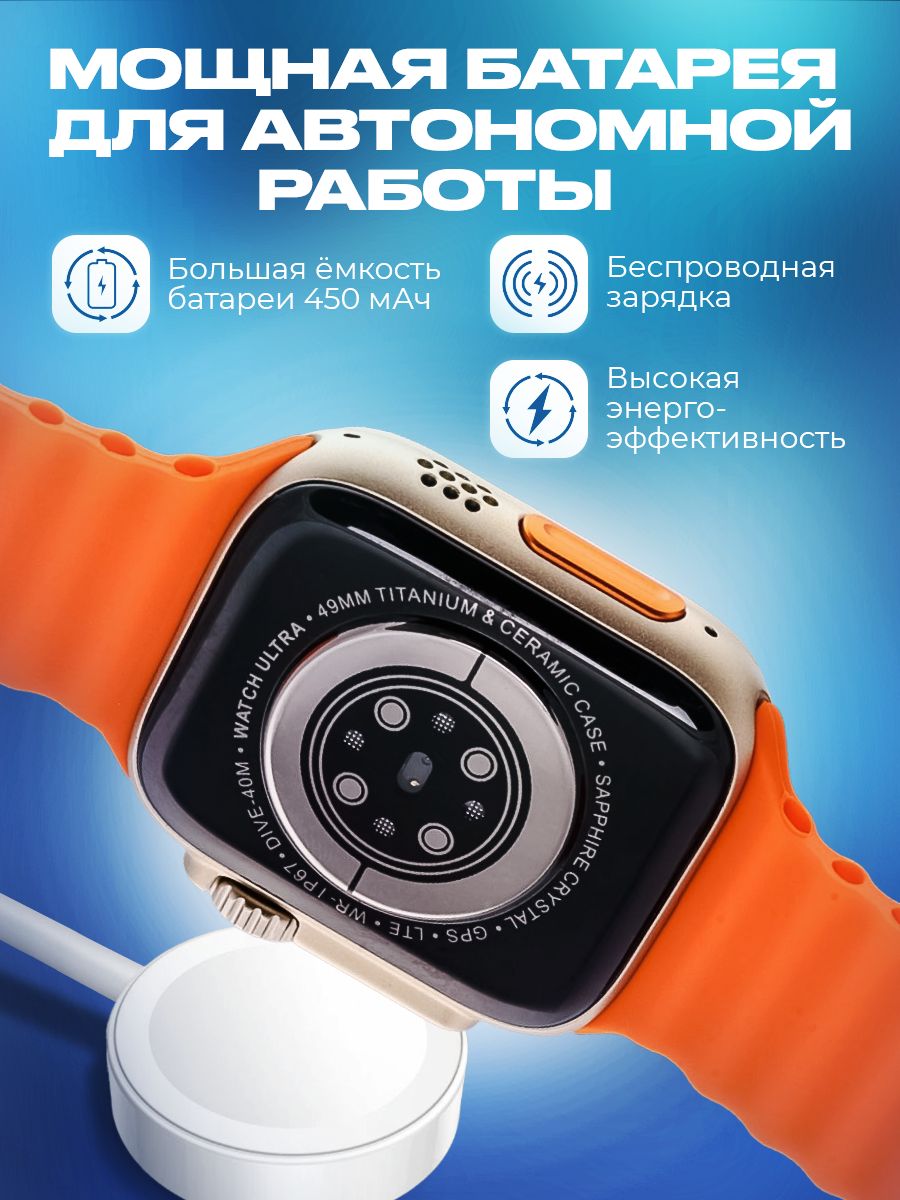 Описание: Смарт часы 8 серии Smart Watch Ultra, с измерением температуры тела и большим экраном - 2 дюйма HD-дизайн с узкой рамкой, с яркой и насыщенной цветопередачей и отзывчивым сенсором. С функцией многофункционального фитнес-трекера, подойдут на каждый день для придания особенного стиля. Умные часы позволяют своевременно получать и передавать необходимую информацию, не доставая телефон из кармана или сумки. При звонке на телефон часы дублируют информацию на дисплее, позволяют принять вызов и поговорить в режиме гарнитуры или по громкой связи. Яркий безрамочный экран, разрешение 420*485 пикселей. Активное колесико больше, а боковая кнопка приподнята над корпусом, что упрощает использование в перчатках. Горячая клавиша мультиспорта. Один клик, чтобы начать тренировку. Защита от пыли и влаги и IP67 позволяет использовать часы при мытье рук и в дождливые дни.