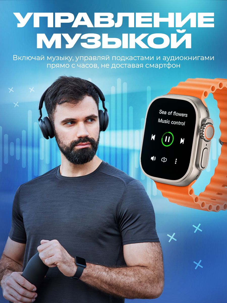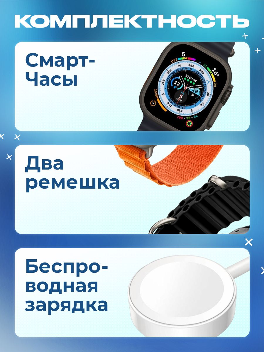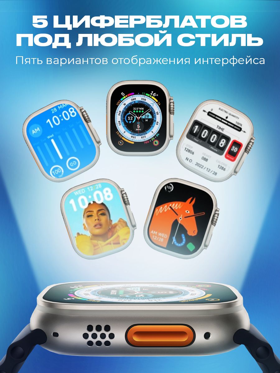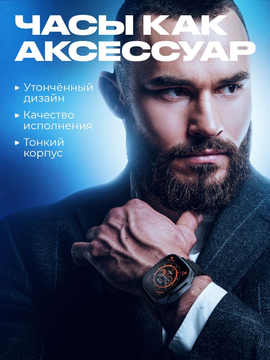 Описание: Смарт часы 8 серии Smart Watch Ultra, с измерением температуры тела и большим экраном - 2 дюйма HD-дизайн с узкой рамкой, с яркой и насыщенной цветопередачей и отзывчивым сенсором. С функцией многофункционального фитнес-трекера, подойдут на каждый день для придания особенного стиля. Умные часы позволяют своевременно получать и передавать необходимую информацию, не доставая телефон из кармана или сумки. При звонке на телефон часы дублируют информацию на дисплее, позволяют принять вызов и поговорить в режиме гарнитуры или по громкой связи. Яркий безрамочный экран, разрешение 420*485 пикселей. Активное колесико больше, а боковая кнопка приподнята над корпусом, что упрощает использование в перчатках. Горячая клавиша мультиспорта. Один клик, чтобы начать тренировку. Защита от пыли и влаги и IP67 позволяет использовать часы при мытье рук и в дождливые дни.