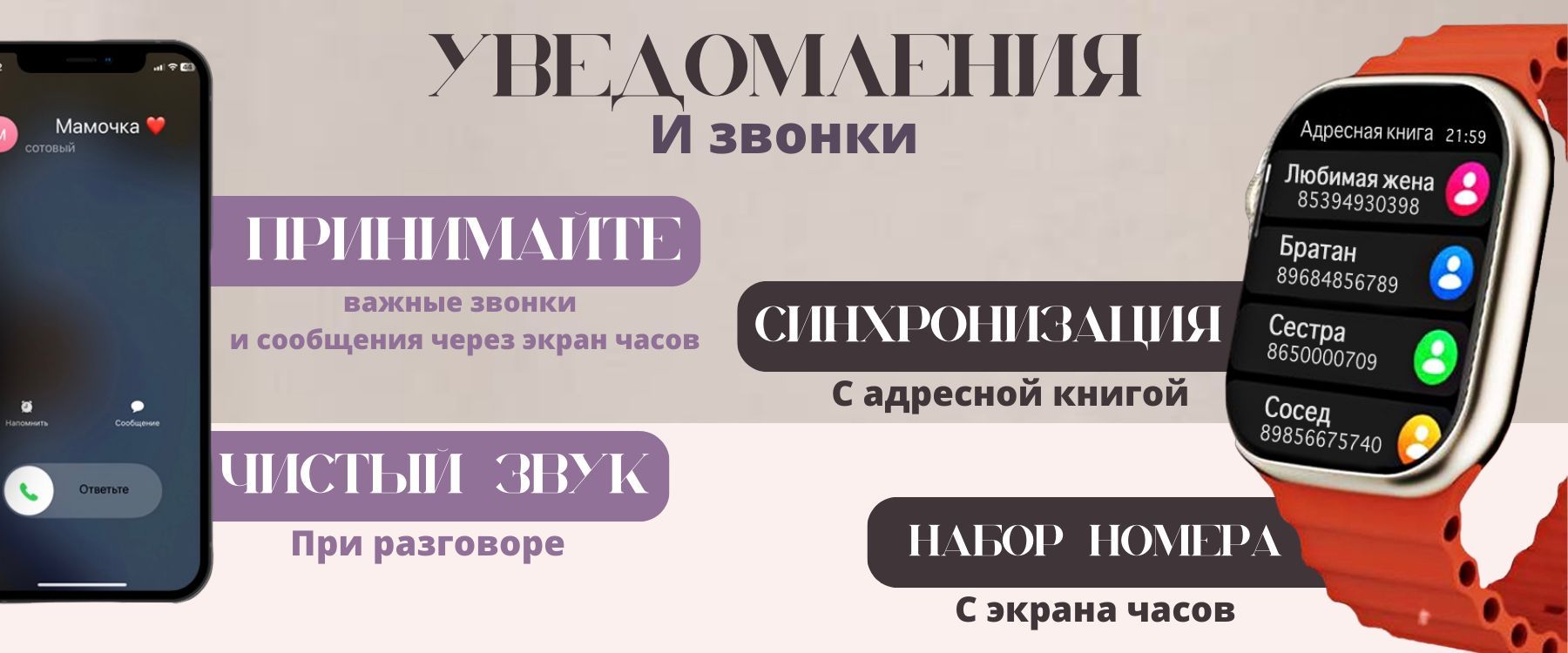 • Уведомления о входящих звонках и сообщениях