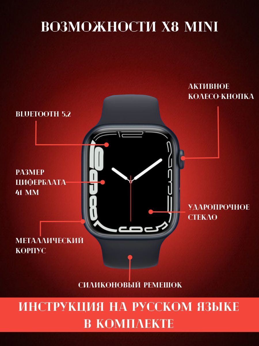 Описание: Smart Watch X8 miniУмные часы x8 mini это новинка с улучшенным динамиком и более быстрым процессором. Smart Watch x8 mini отлично подходят как для мужчин, так и для женщин. Отзывчивый сенсор и качественная синхронизация со смартфонами на платформах Android или iOS с помощью Bluetooth 5.2 порадуют своей точностью и стабильным соединением. Меню часов полностью на русском языке ,теперь пользоваться часами ещё удобнее.Быстрый заряд , долгое использование!Часы имеют емкость аккумулятора 380 mah, что позволяет работать им в активном режиме до 72 часов , а время автономной работы составляет до 7 дней! Быстрая беспроводная зарядка позволит полностью зарядить батарею менее чем за час.Следи за здоровьеми не только!Smart Watch X8 mini имеют множество встроенных функций :