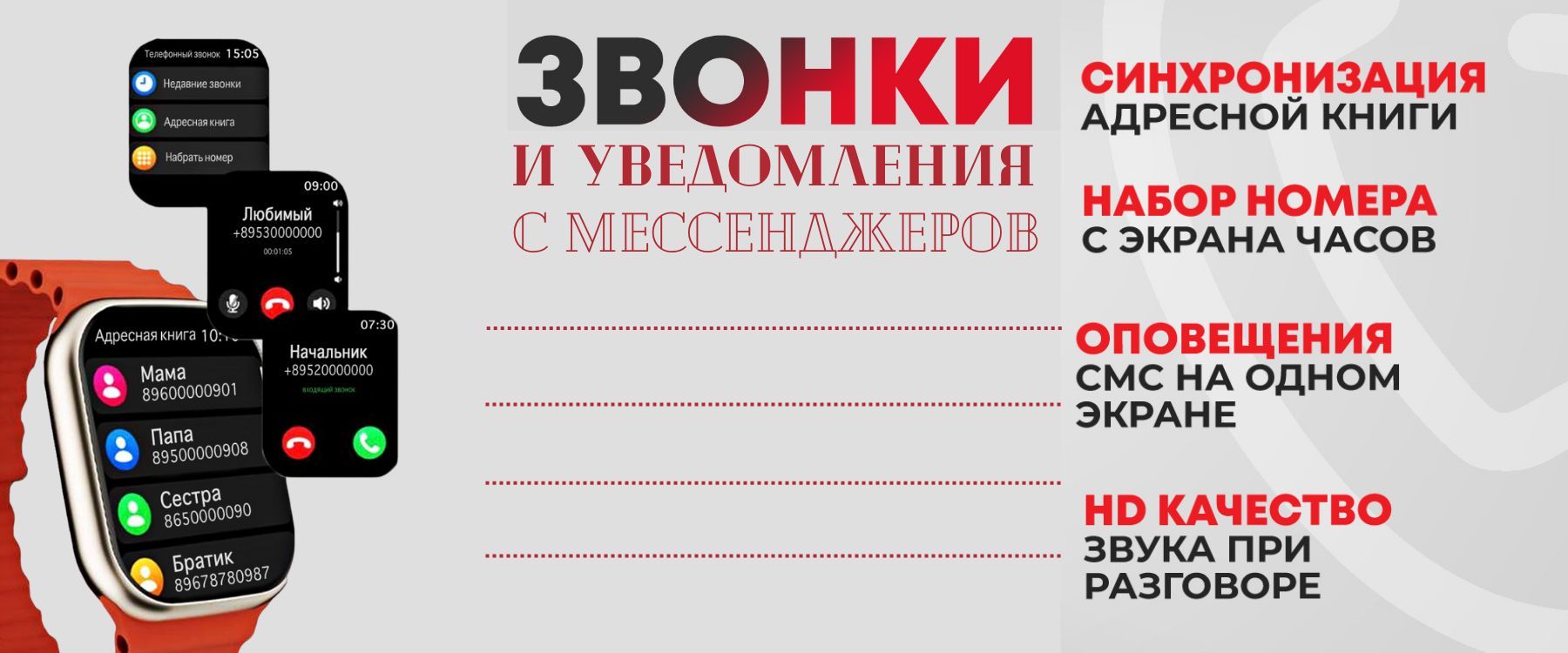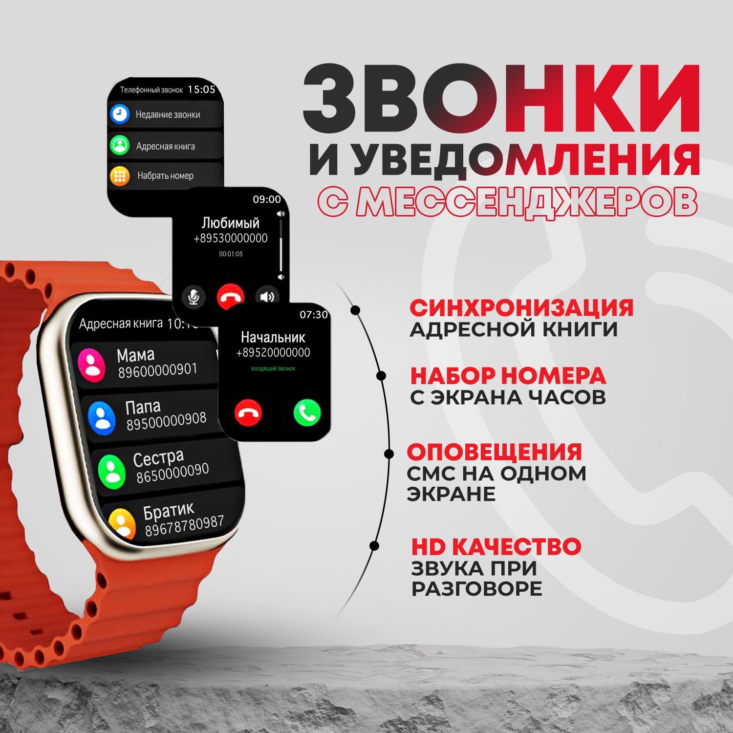 При получении входящих звонков , вы будете видеть не только номер телефона , но и имя звонящего.КомплектацияВ комплекте с часами вы получаете беспроводную магнитную зарядку, инструкцию на русском языке и два ремешка(силиконовый и тканевый ремешок). Плотная застежка, качественные материалы гарантируют удобство и комфорт при ношении часов.Сложности с настройкой?Если у вас возникли вопросы, ознакомьтесь с инструкцией по подключению часов или свяжитесь с нами через чат продавца.