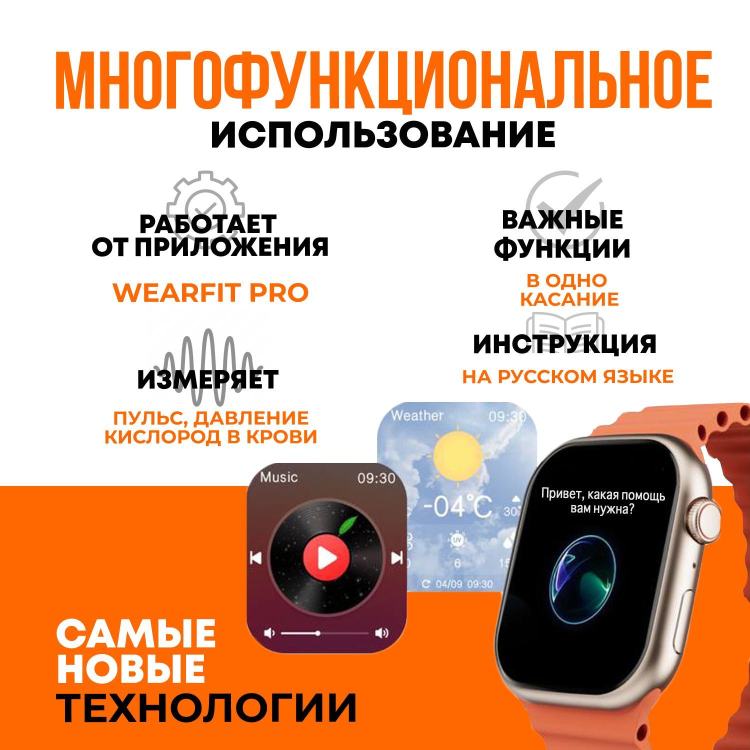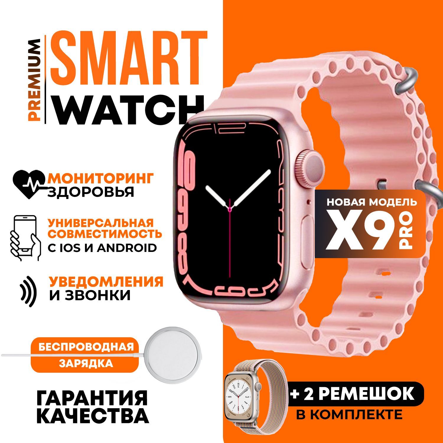 Описание: Текстовое описание изображенияSmart Watch X9 ProУмные часы x9 Pro это новинка с улучшенным динамиком и более быстрым процессором. Smart Watch x9 Pro отлично подходят как для мужчин, так и для женщин. Отзывчивый сенсор и качественная синхронизация со смартфонами с помощью Bluetooth 5.2 порадуют своей точностью и стабильным соединением. Меню часов полностью на русском языке ,теперь пользоваться часами ещё удобнее.Текстовое описание изображенияБыстрый заряд , долгое использование!Часы имеют емкость аккумулятора 450 mah, что позволяет работать им в активном режиме до 72 часов , а время автономной работы составляет до 7 дней! Быстрая беспроводная зарядка позволит полностью зарядить батарею менее чем за час.Текстовое описание изображенияСледи за здоровьеми не только!Smart Watch X9 Pro имеют множество встроенных функций :