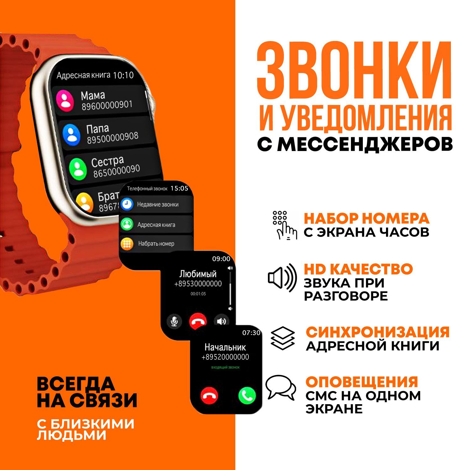 И другие.Текстовое описание изображенияВсегда на связи!Smart Watch X9 Pro могут звонить, отслеживать звонки, сообщения и уведомления приложений. Встроенный динамик и микрофон позволят совершать звонки прямо с часов.