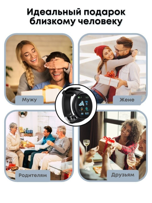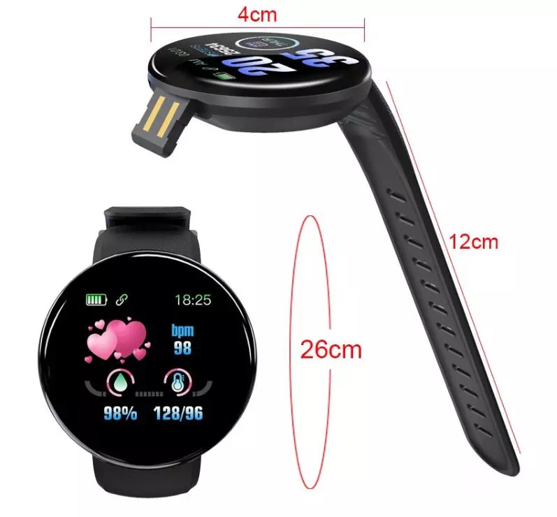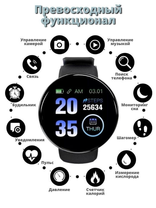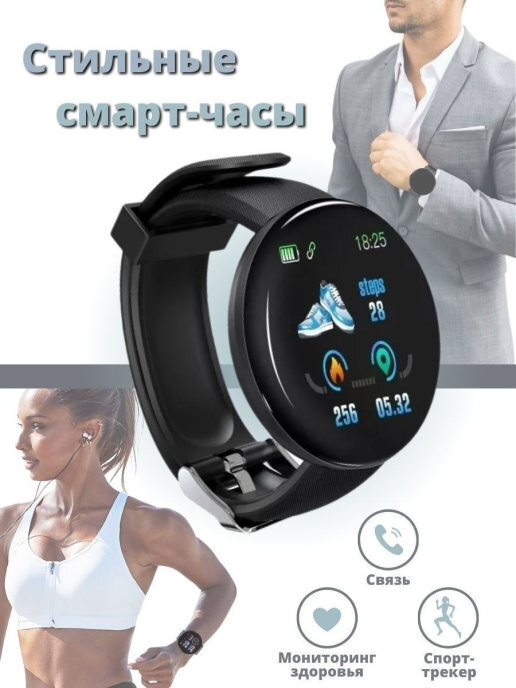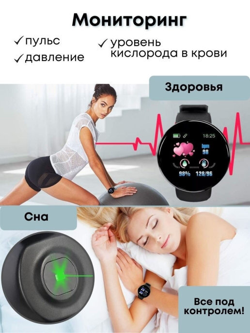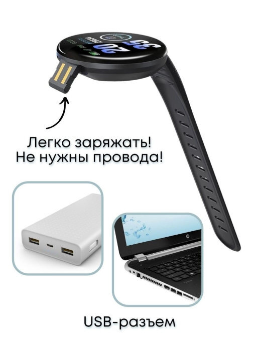 Описание: Смарт-часы Smart Watch D18 - модель умных часов с функцией многофункционального фитнес-трекера. Поддерживает подключение с помощью Bluetooth 5.0 к смартфонам на платформах Android или iOS. Компактный и удобный в использовании: надежный ремешок, простая навигация, оптимальный размер. Не нуждаются в зарядном кабеле, так как они оснащены зарядным контактом, который позволяет заряжать часы напрямую от USB зарядки. Часы отслеживают вашу активность, считая пройденные шаги и рассчитывая количество потраченных калорий. Смарт-браслет поддерживает мониторинг артериального давления, кислорода в крови, сна и напоминание о сидячем положении. Пылевлагозащитная функция степени IP67 защищает наушники от частиц пыли, пота, дождя, и от других контактов с водой не более 3-х минут. Чтобы начать использование смарт часов, необходимо скачать и установить на смартфон бесплатное приложение FitPro. Умные часы D18 - отличный подарок жене, мужу, коллеге, другу на праздник или себе.