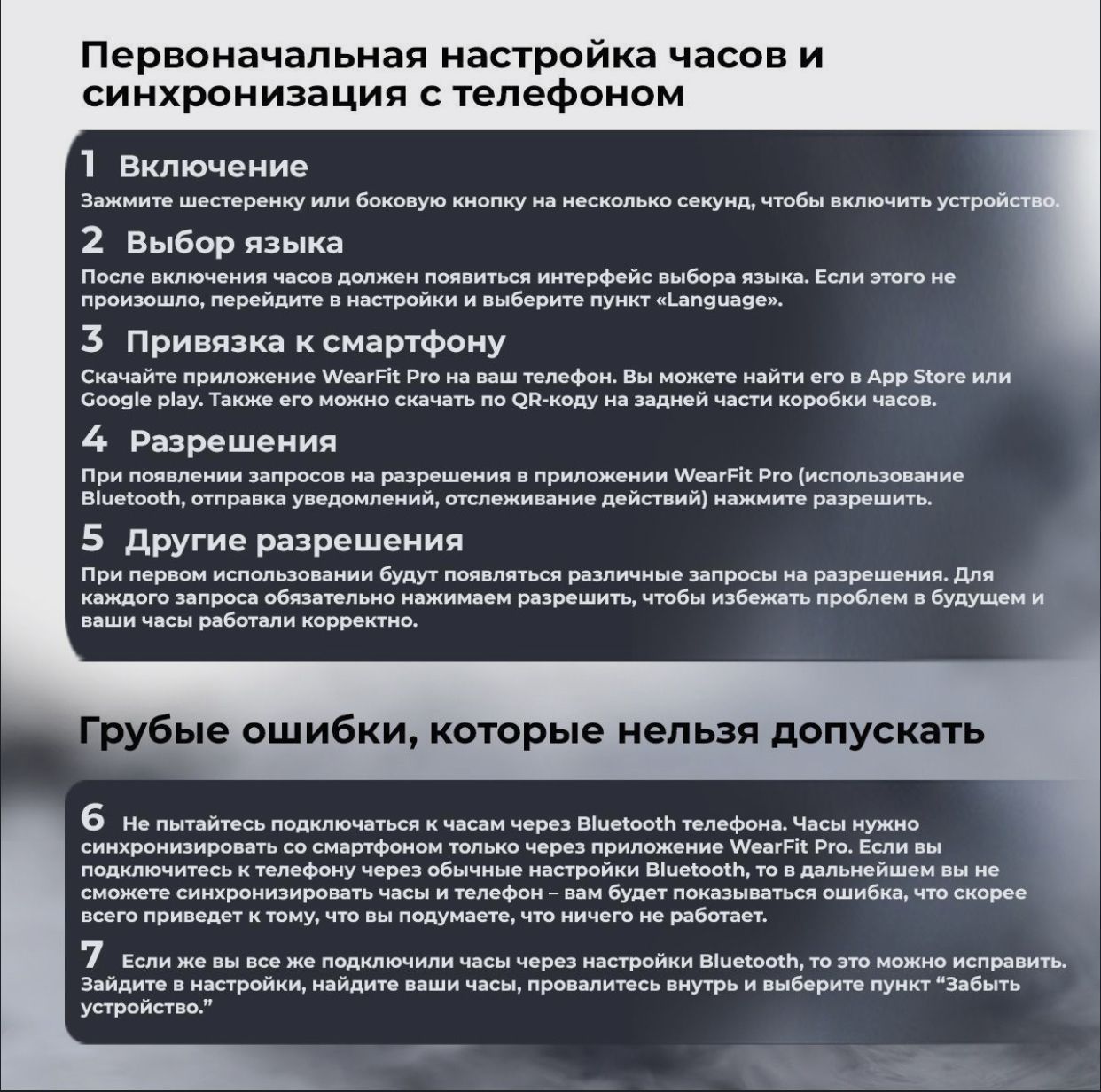 Примечание: не носите его в сауне или горячей ванне, чтобы избежать повреждения компонентов, вызванного попаданием водяного пара в часы.Приложение: Wearfit Pro (скачать приложение на смартфон можно через Google Play или App Store).Обратите внимание!