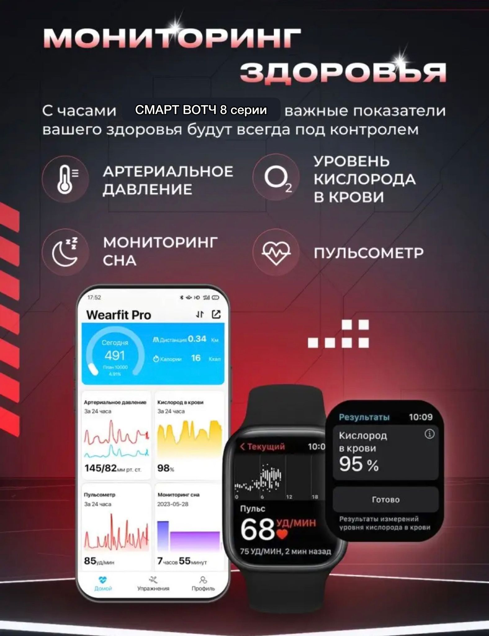 В смарт-часы встроены модули для замеров параметров здоровья: сердцебиения, давления, уровня кислорода в крови. Также в умные часы встроен шагомер.
