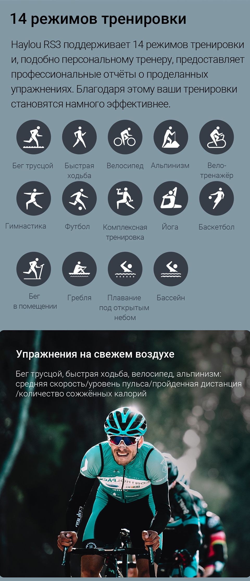 Haylou RS3 предлагает 14 режимов тренировок и предоставляет профессиональные отчеты о тренировках, похожие на помощь персонального тренера.