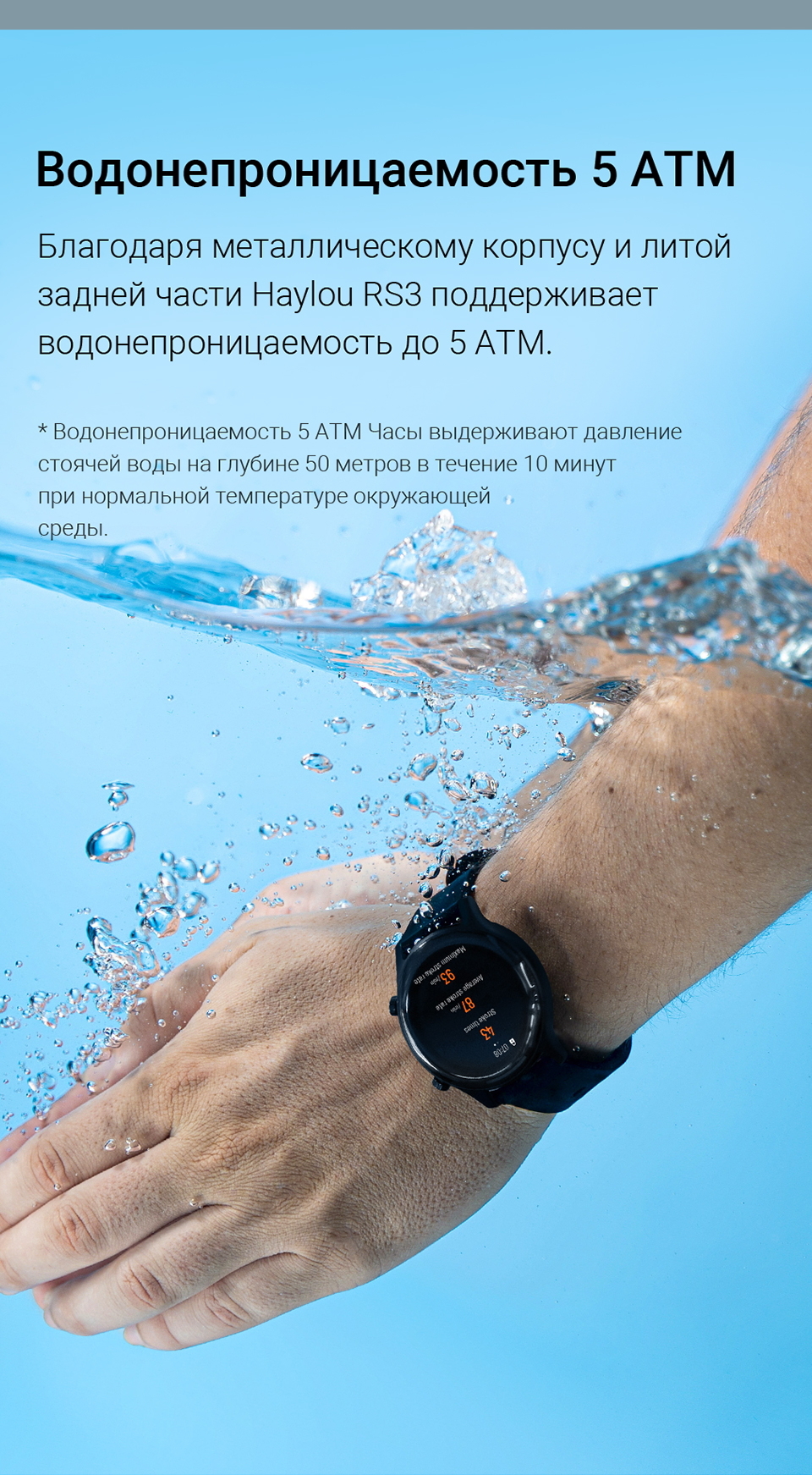 Haylou RS3 рассчитан на водонепроницаемость до 5 АТМ, благодаря металлическому корпусу и литой задней части.