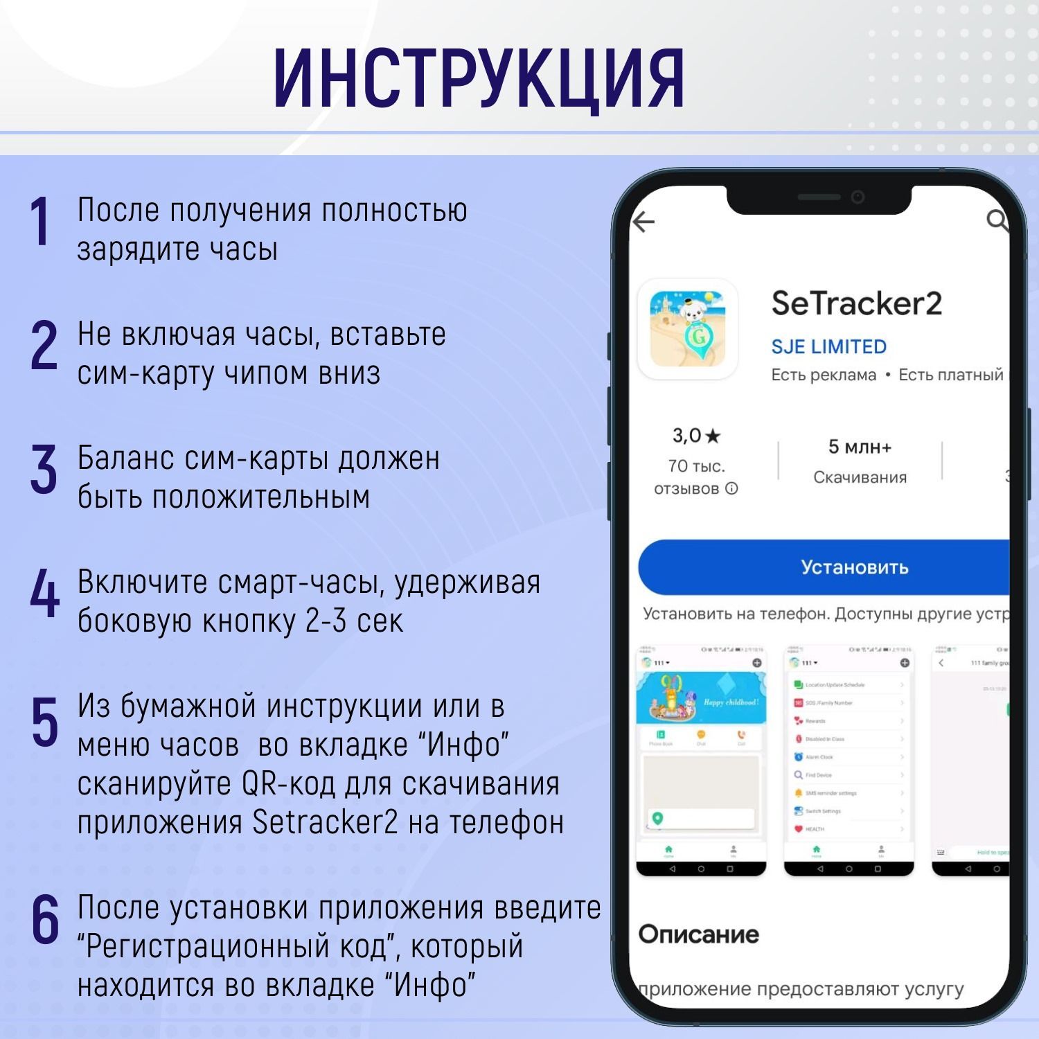 Описание: Смарт часы детскиеСмарт часы детские наручные - это инновационное устройство, которое предоставляет родителям возможность быть в курсе местоположения своего ребенка в любое время. НадежностьРодитель может позвонить на умные часы детям и незаметно прослушать окружающую обстановку.  Детям не будут поступать посторонние звонки. В детских умных часах можно мыть руки и не снимать при физических нагрузках с функцией влагозащиты.ФункцииОсновными функциями смарт часов для школьника являются кнопка SOS, точная геолокация с помощью GPS, звонки и сообщения, обратный звонок, будильник, камера и фонарик. При нажатии на кнопку SOS, детские смарт часы автоматически отправляют сигнал с оповещением о местоположении ребенка на устройство родителей. Родители могут использовать приложение SeTracker2 для просмотра актуального местоположения ребенка в режиме реального времени. Детские умные часы также имеют функцию будильника, что помогает детям быть вовремя в учебе или на других занятиях. Контроль геопозиции ребенкаПодключение детских часов с gps и телефоном к смартфону родителей с помощью приложения SeTracker2 предоставляет родителям еще больше возможностей. В приложении можно установить безопасные гео-зоны для нахождения ребенка, а также просматривать его маршруты перемещения за последние 30 дней. Умные часы с сим-картойУмные часы для детей - это надежное и удобное устройство для обеспечения безопасности и связи с ребенком.