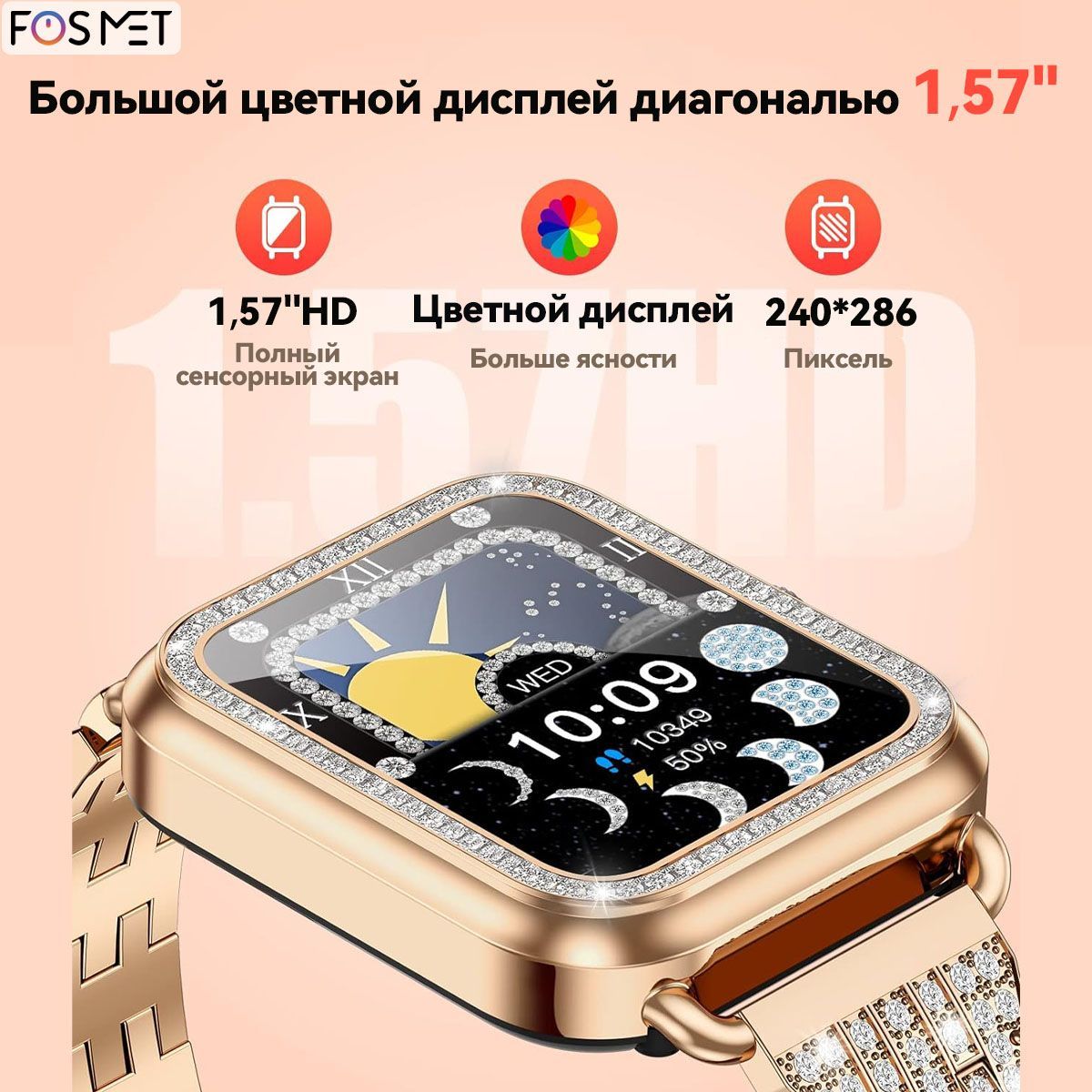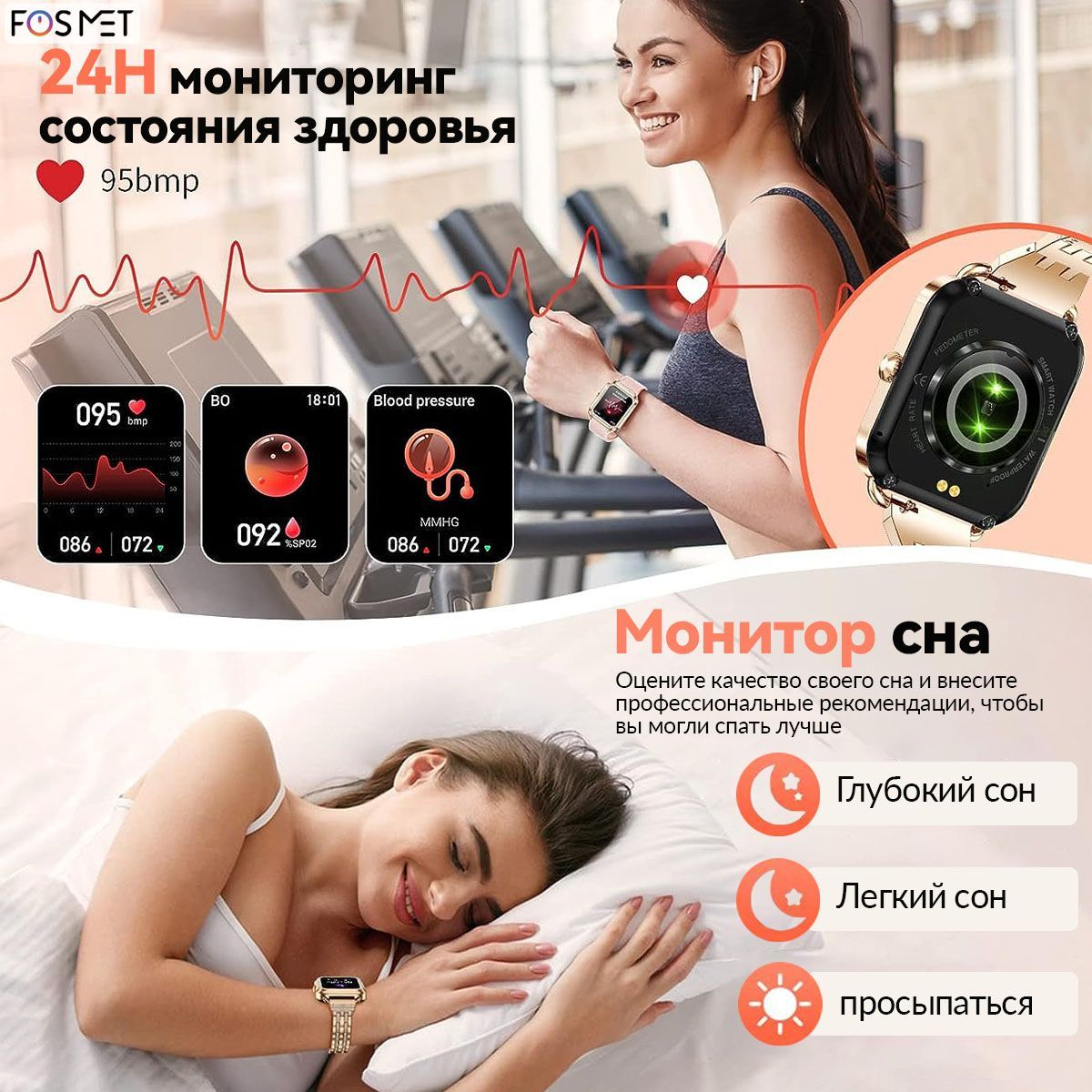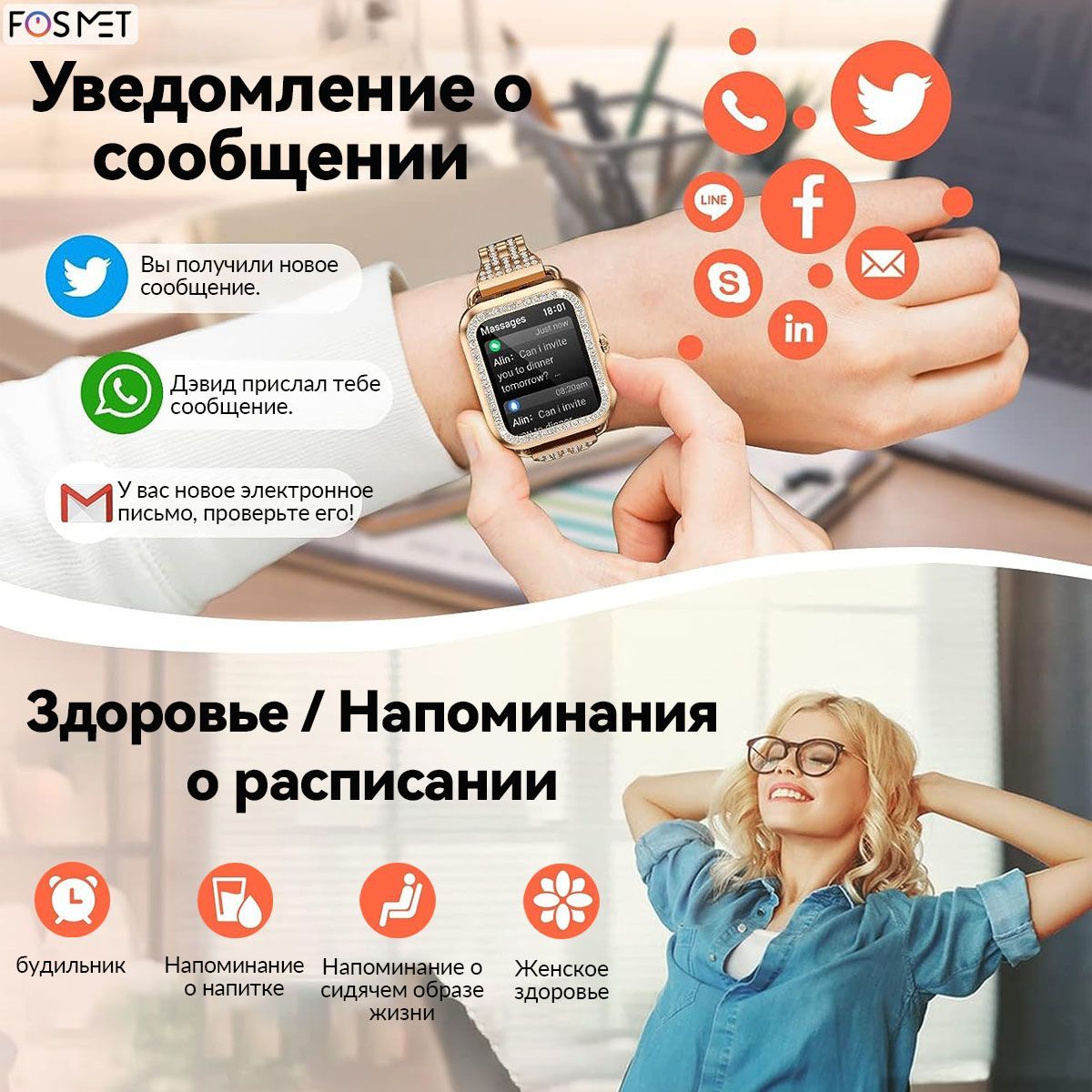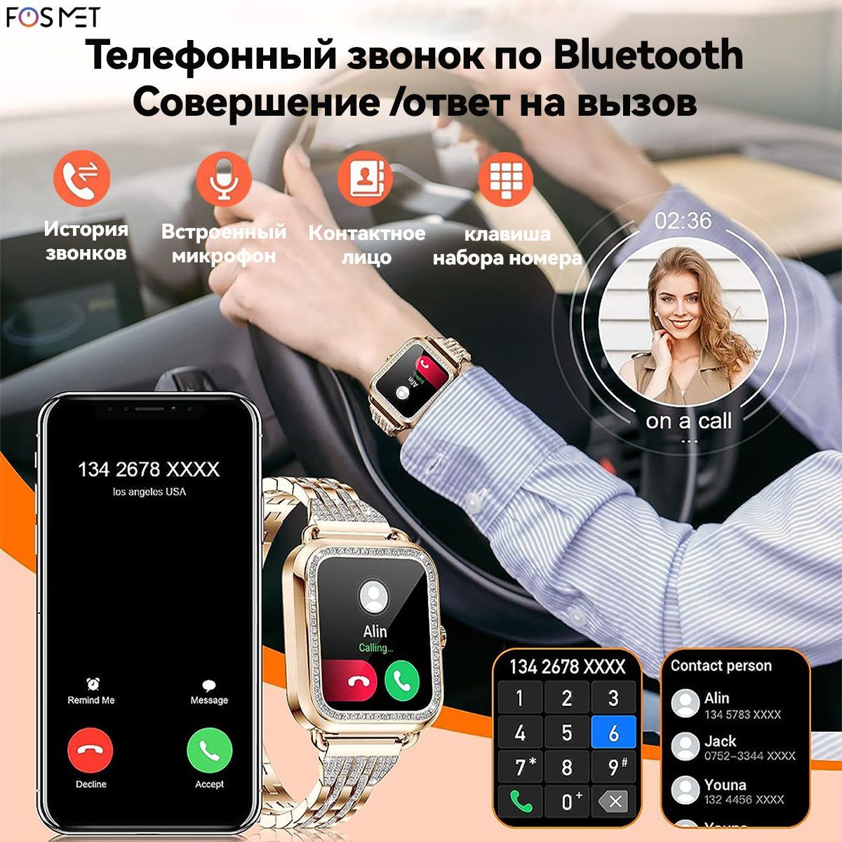 Описание: Совершенно новый сверхбольшой и сверхчистый экран1,57-дюймовый дисплей с разрешением 240 * 286 пикселей обладает более четкими визуальными эффектами и более высокой детализацией изображения.Женские умные часы FOSMET тщательно проработаны в деталях, которые больше подходят для тонких женских запястий.Сияйте как звездаРемешок из позолоченной стали с инкрустацией бриллиантов и узорами, сочетается с бриллиантовым циферблатом, чтобы вы сияли на вечеринке.Самые яркие женские смарт-часы в 2023 годуУникальный дизайн циферблата придает вашему запястью своеобразную роскошь.Мода и роскошь гармонично сочетаются, создавая идеальное сочетание.Будь то посещение торжественного ужина, светского раута или повседневного наряда, эти женские цельные часы станут вашим модным акцентом и будут излучать особый шарм.Функция вызова по BluetoothСмарт-часы FOSMET используют технологию подключения по Bluetooth 5.2, скорость соединения выше и стабильнее, а также оснащены высококачественными динамиками для отображения звука высокой четкости.Вы можете напрямую отвечать на звонки / совершать их, регулировать громкость, синхронизировать контакты и историю последних вызовов.Instagram Facebook, Instagram Instagram, Twitter и другие приложения получают информацию из SMS, WhatsApp, Facebook, Instagram, Twitter и других приложений.Следите за своим здоровьемВ женских фитнес-часах FOSMET используется новый оптический датчик движения, который может предоставлять более точные данные для отслеживания вашей повседневной деятельности, шагов, пройденного расстояния, времени упражнений, сожженных калорий. Эти умные часы также могут контролировать частоту сердечных сокращений, кровяное давление и кровяное давление на в любое время.Уровень кислорода и артериальное давление, анализ ночного сна, напоминание о сидячем положении, напоминание о питье воды и другие функции, он также может записывать и анализировать данные сна за 7 дней. Это поможет вам оставаться в форме по-научному и принимать комплексные меры по охране здоровья.Специально для женщинУправление менструальным циклом женщин Умные часы имеют 3 режима записи состояния женского здоровья: менструальный период, период подготовки к беременности и период вынашивания ребенка, что позволяет вам легко контролировать свою жизнь и проводить каждый особенный день со спокойной душой.Более 190 циферблатовциферблат поддерживает персональную настройку фотографий, а приложение объединяет более 190 различных стилей циферблатов. Эти женские умные часы оснащены классическим ремешком из нержавеющей стали и удобным силиконовым ремешком, что делает их подходящими для самых разных случаев.Интересный функциональный опытИсследуйте многофункциональные женские умные часы, устанавливающие спортивные цели, управляющие камерой, музыкой, погодой, играми, будильником, секундомером, таймером, вращающимся запястьем для подсветки дисплея и другим практичным оборудованием, которое сделает умные часы FOSMET более совершенными.Умные часы совместимы с большинством смартфонов, оснащенных системой Android 4.4 и iOS 8.0 или более поздней версией.Полная зарядка занимает всего 2 часа, и ее можно использовать в течение 3-4 дней или в режиме ожидания в течение 10 дней.19 спортивных режимов и уровень защиты IP67Фитнес-часы поддерживают 19 спортивных режимов (ходьба, езда на велосипеде, йога, плава