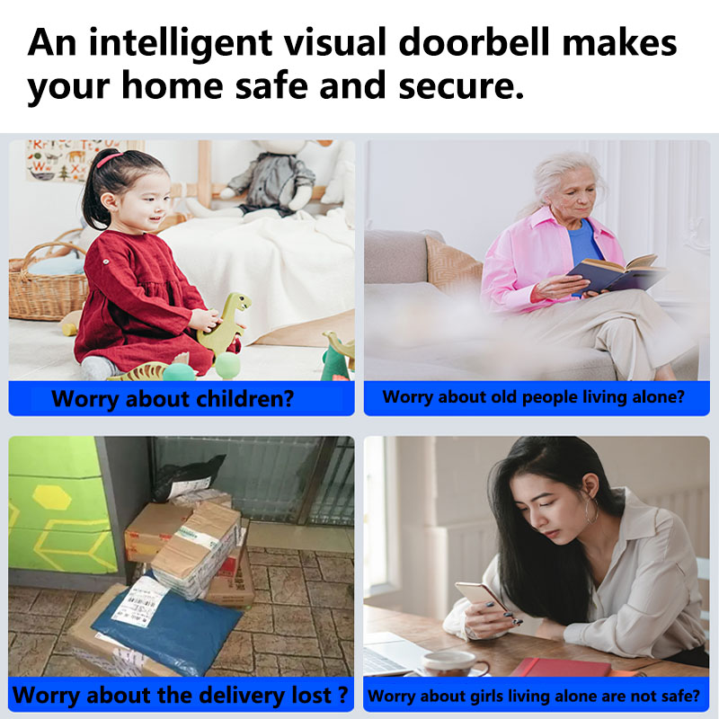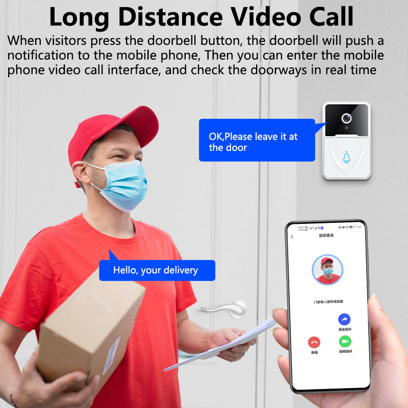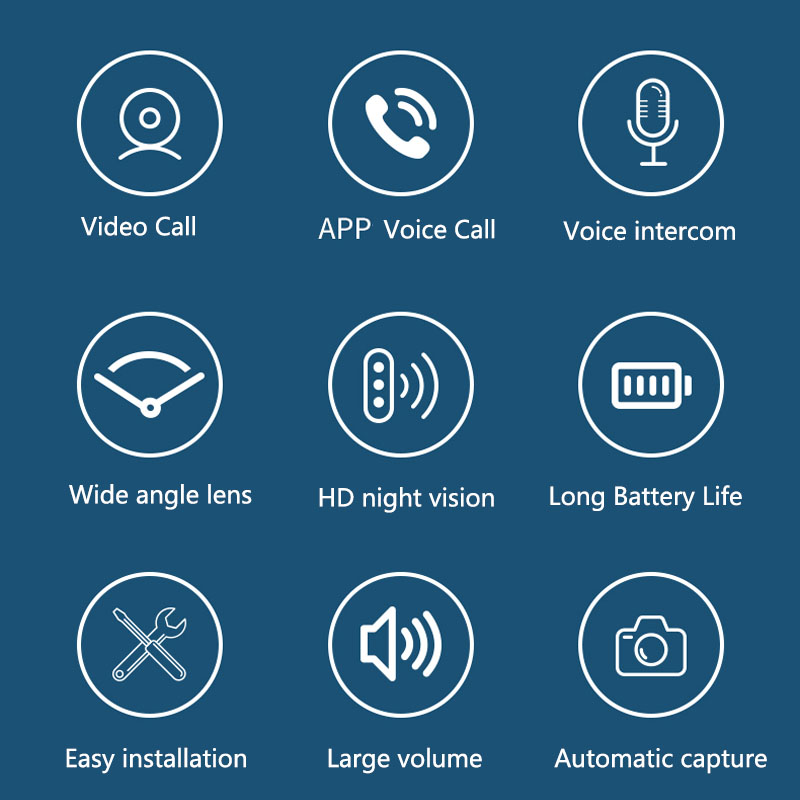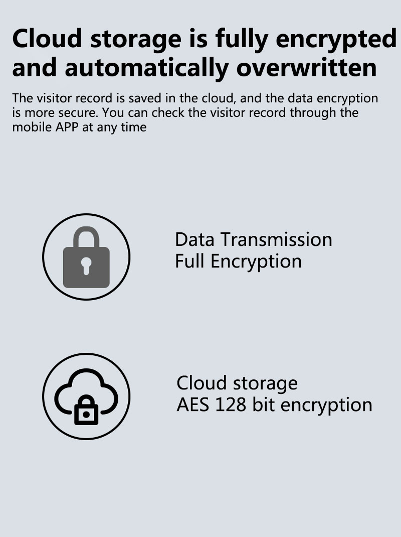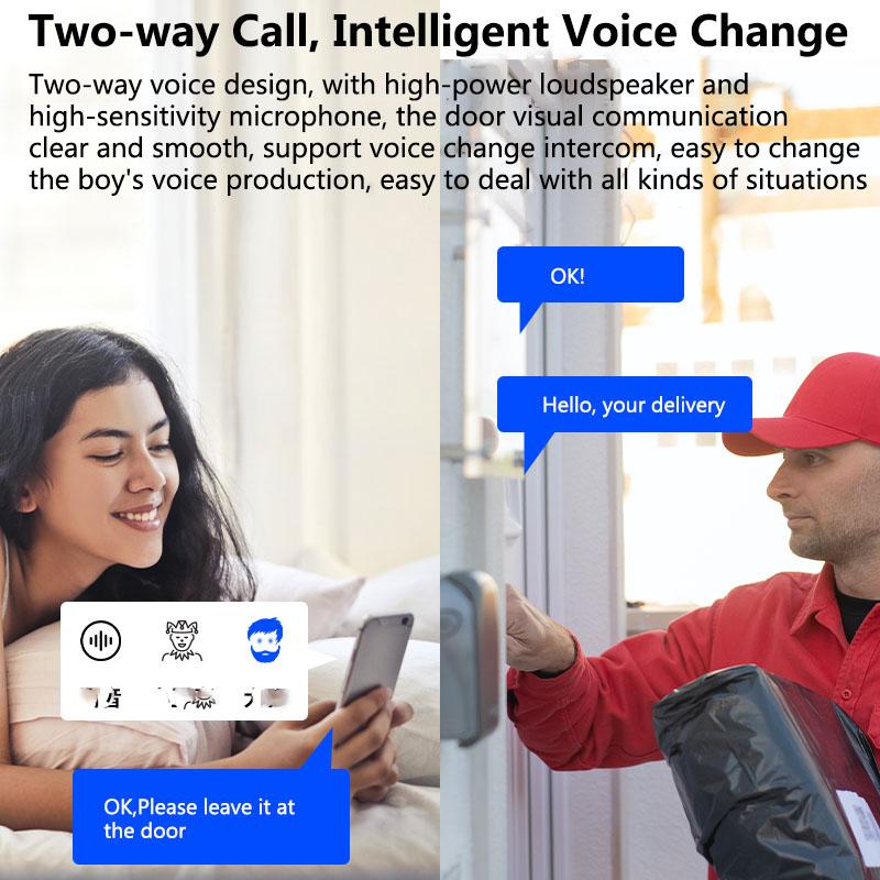 Двусторонний диалог, интеллектуальное преобразование голоса: двусторонний голосовой дизайн, оснащенный мощными динамиками и высокочувствительными микрофонами, для достижения визуальной связи двери автомобиля, яркой и плавной, поддержка внутренней связи с преобразованием голоса, легко преобразует голос мальчика и легко реагирует на различные ситуации, Когда Посетитель нажимает на дверной звонок Когда вы нажимаете кнопку, дверной звонок отправляет уведомление на ваш телефон, а затем вы можете использовать интерфейс видеозвонка вашего телефона и проверять состояние открытия двери в режиме реального времени. Поддержка облачного хранилища и шифрования данных.