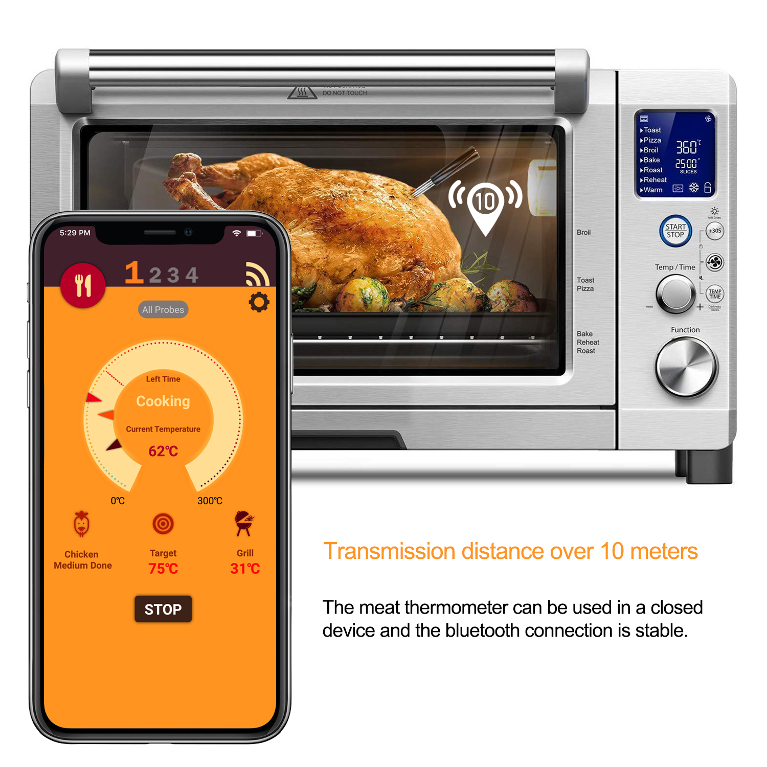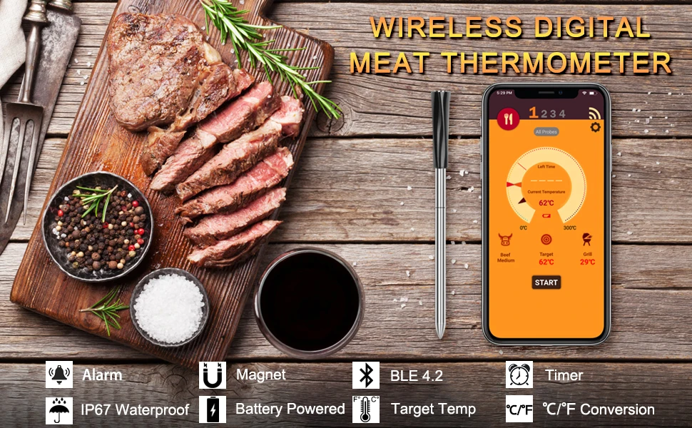 ► Модель диапазона 100 футов:100% БЕЗ ПРОВОДА, идеально подходит для приготовления пищи на открытом воздухе. На открытой местности (без каких-либо препятствий) он имеет 100-футовый диапазон Bluetooth. Вы можете следить за приготовлением пищи с помощью наших БЕСПЛАТНЫХ приложений, которые доступны для смартфонов iOS / Android.