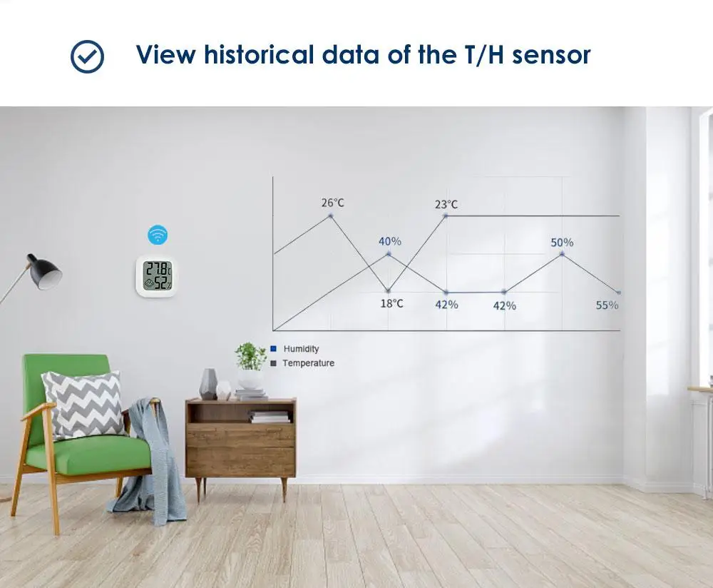Датчик работает от батареи. Датчик будет контролировать температуру и влажность в режиме реального времени. Датчик сообщит, когда температура и влажность изменятся очень незначительно. Вы можете просматривать изменения значения в приложении или на экране дисплея. Запишите изменения температуры и влажности в приложении и используйте графику, чтобы показать вам.