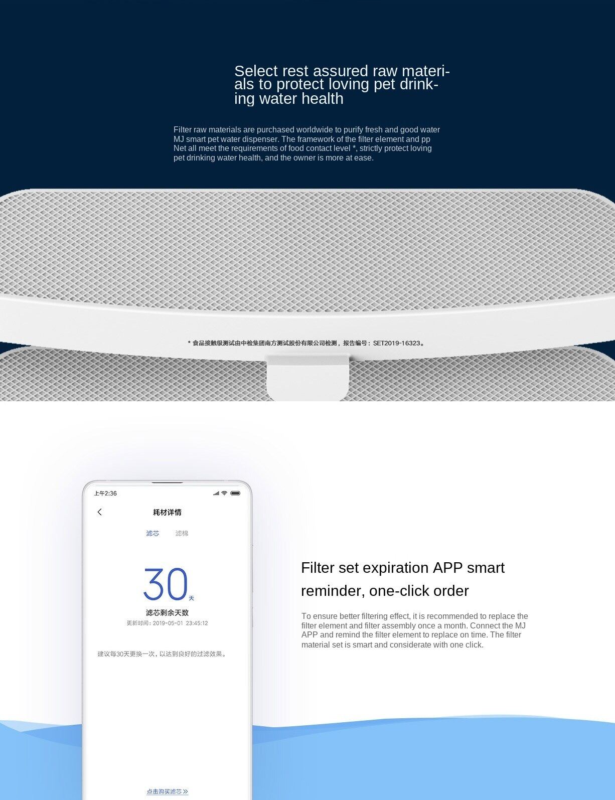 Чтобы обеспечить лучший фильтрующий эффект, рекомендуется заменять фильтрующий элемент и фильтрующий узел один раз в месяц. Подключитесь к приложению Mijia, вовремя напомните о замене фильтрующего элемента.