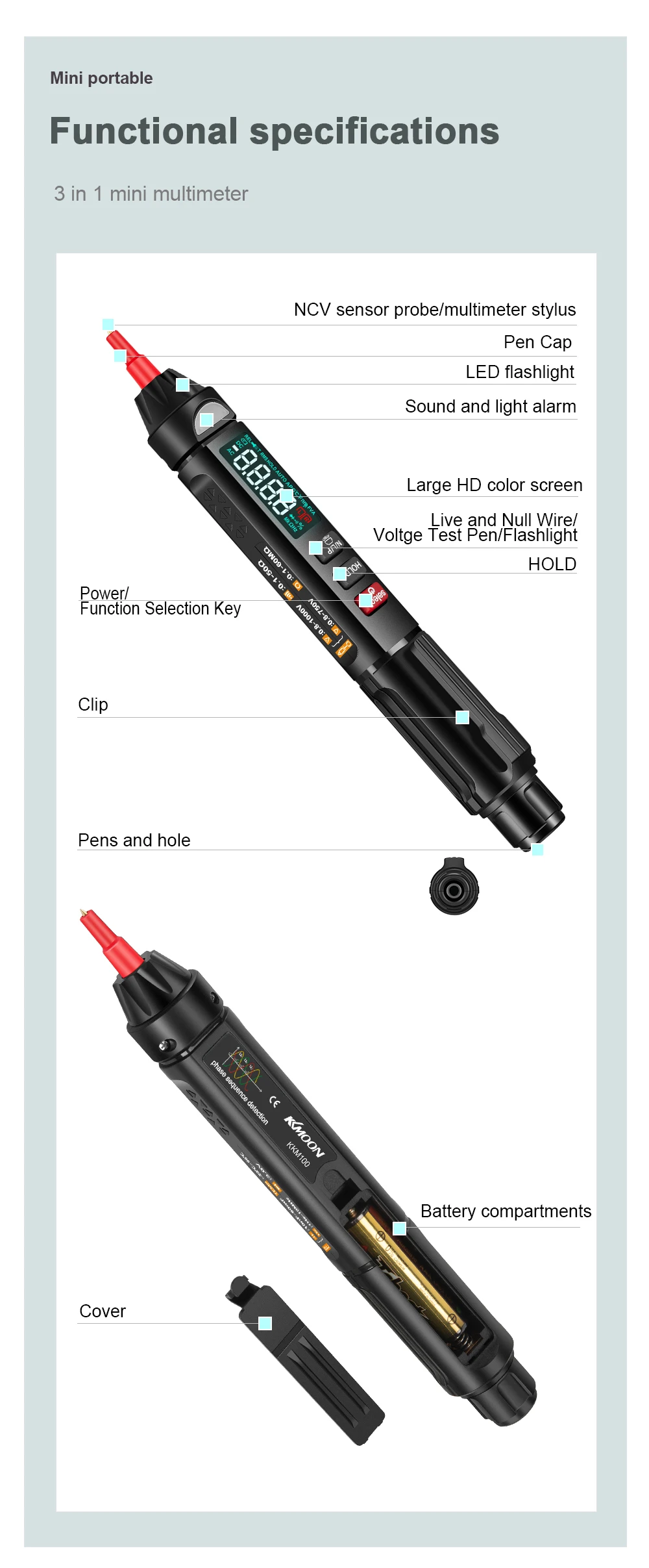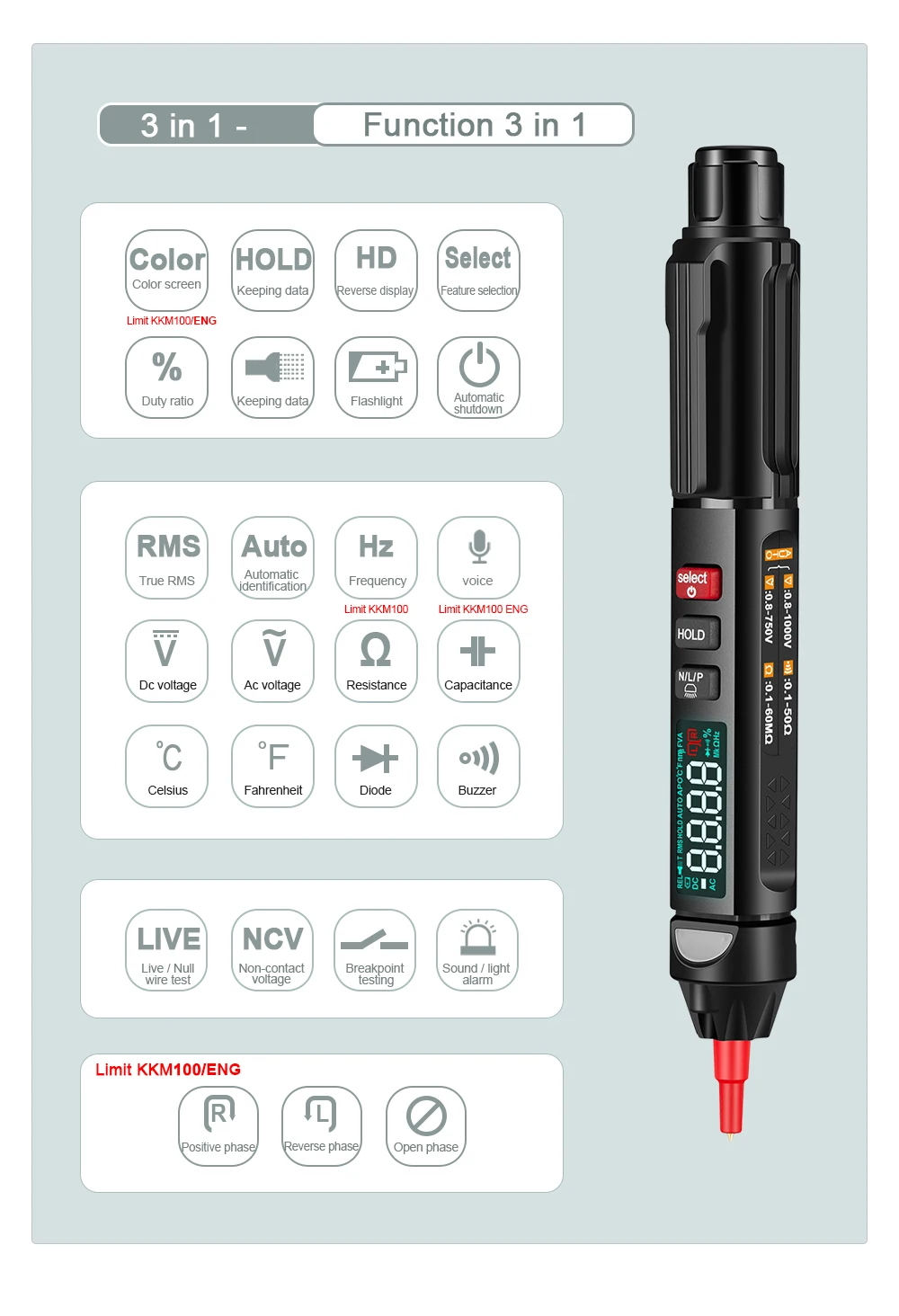 It not only the multimeter, but also the voltage test pens, for the kkm100 type, it also has the phase sequence measurement function which the kkm99 not has.