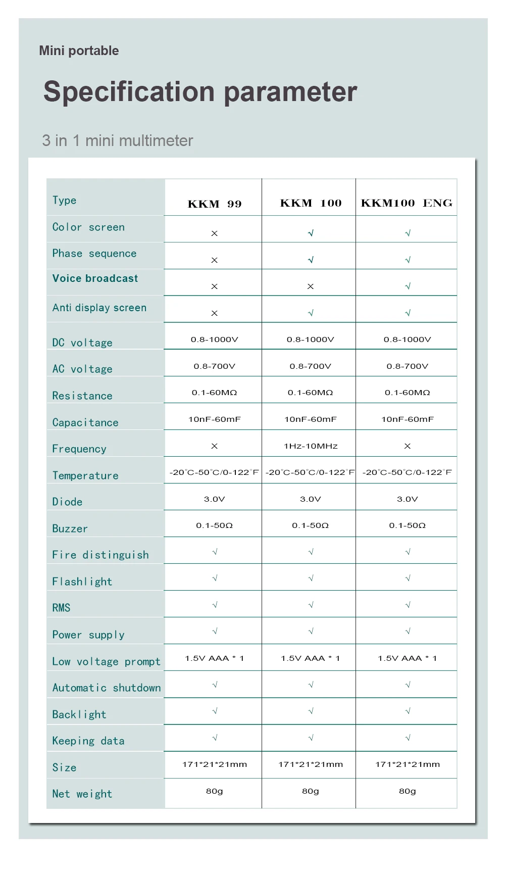 Voice broadcast function: With the auto measurement and auto identification function, also with the voice broadcast function, which is intelligent and convenient.(ONLY KKM100-ENG)
