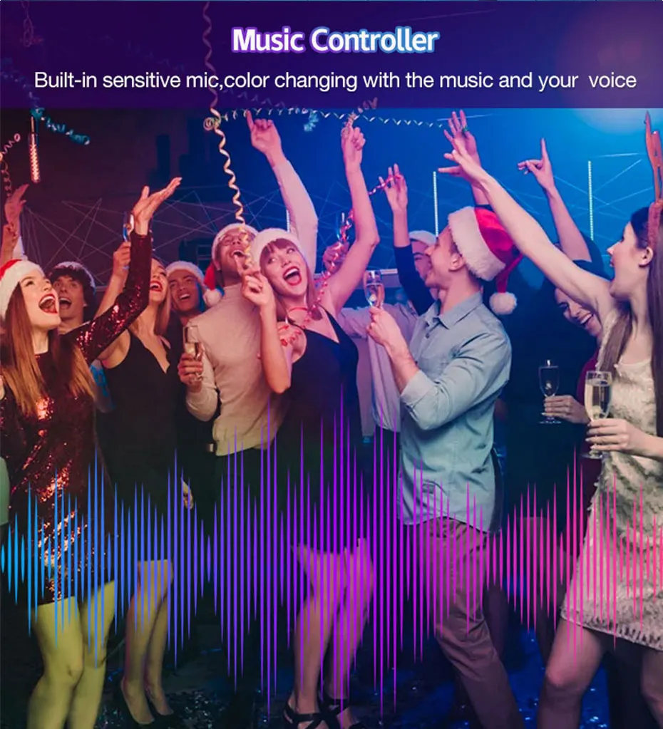 【Музыкальный режим 】 среди трех контроллеров, Bluetooth и Tuya WiFi контроллеры имеют режим музыкального ритма, встроенный микрофон с регулируемой чувствительностью, И цвет веревки светильник изменится с ритмом звука и музыки. Создайте романтическую, великолепную и интересную волшебную атмосферу для ваших вечерние. Отрегулируйте светильник для включения или выключения в определенное время.
