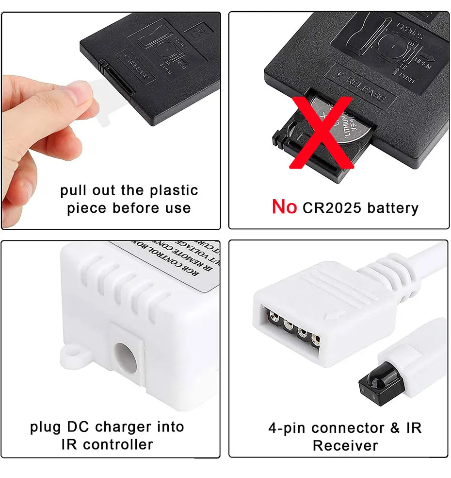 1. Подключите ИК, wifi и Bluetooth контроллер к светодиодный светильник через 4-контактный разъем и подключите к источнику питания через адаптер питания на светильник через порт постоянного тока.