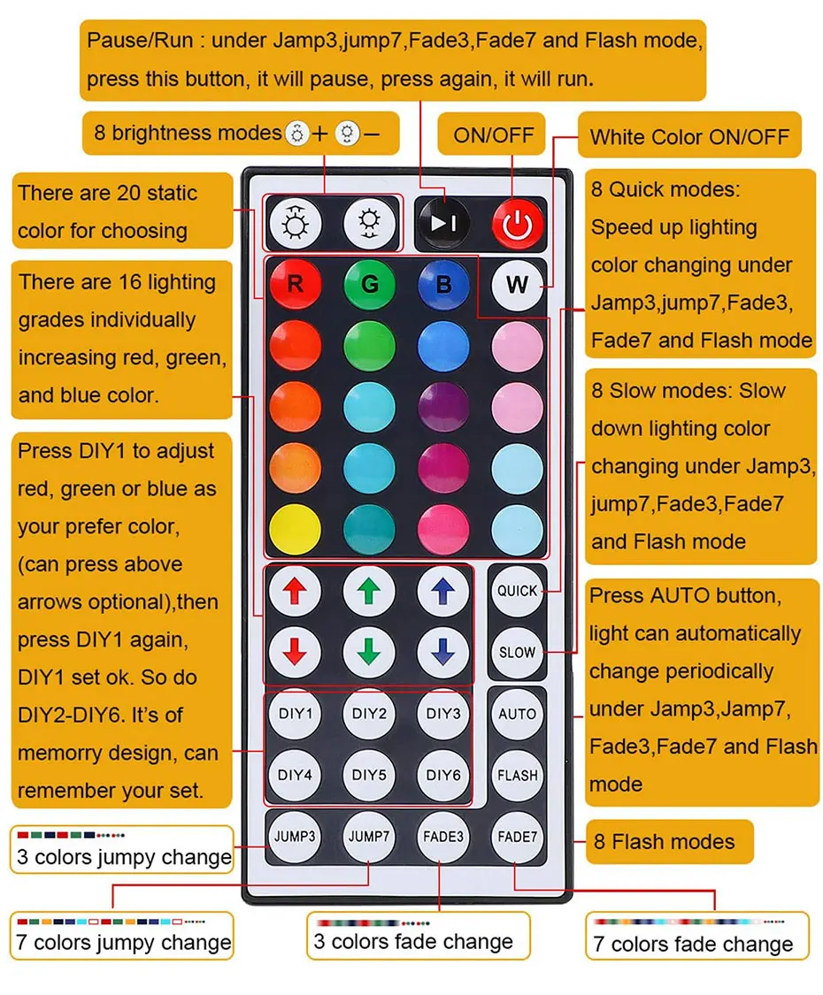 【Способы управления 】 ленточный светильник можно управлять через Bluetooth или wi-fi-соединение. Он оснащен 24-кнопочным инфракрасным дистанционный пульт с 4 режима музыки. Цветные огни можно управлять без проводов, даже если вы не дома, без ограничения расстояния. Управление светодиодный голосом светодиодный свет, и б/у с Amazon Alexa и Google Assistant с помощью простых Голосовое управление. Просто используйте «включить/выключить светильник», «изменить цвет на синий», «затемнить/осветить светильник», чтобы контролировать общение, третий метод управления 44-кнопочным инфракрасным дистанционный пульт.