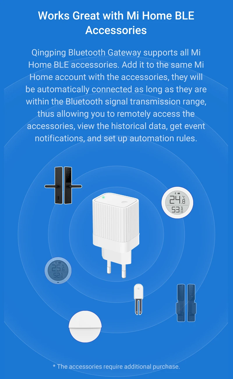Шлюз Qingping Bluetooth поддерживает все устройства шлюзов Mijia Bluetooth. Добавьте их в одну и ту же учетную запись счетчика, только чтобы быть в пределах диапазона передачи сигнала Bluetooth, он автоматически подключится, что, в свою очередь, позволяет удаленно из мобильного приложения Mijia View STATUS, исторические данные или уведомления о событиях, настройки, И интеллект других устройств Linkage и других операций.