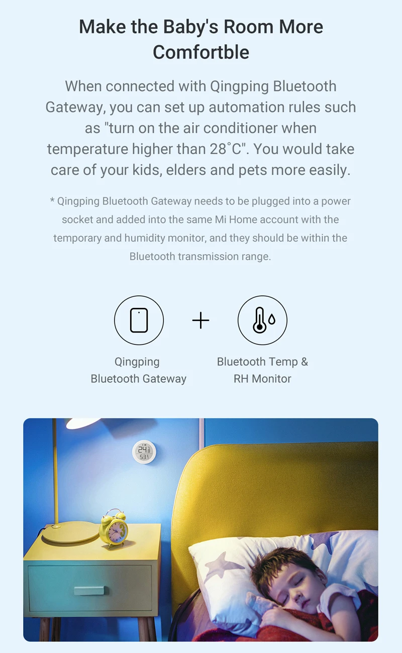 * Qingping Bluetooth Gateway должен быть правильно подключен к источнику питания, а также с помощью термометра и гигрометра Bluetooth,