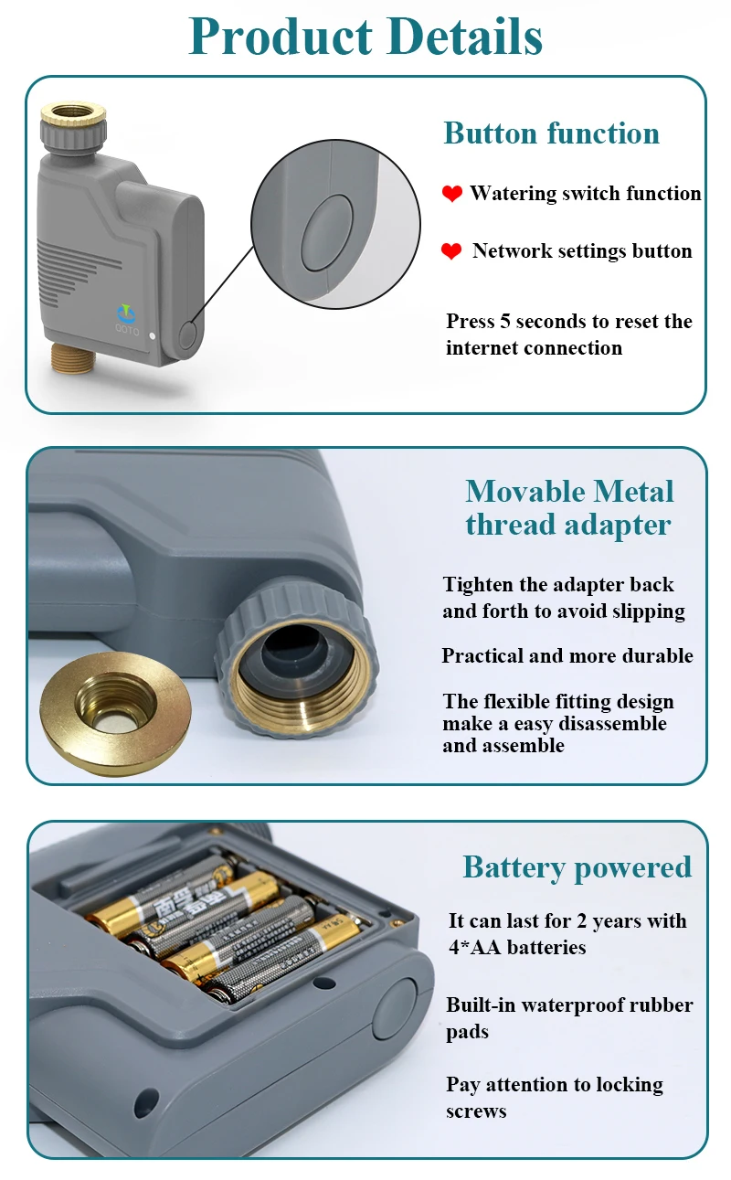 Небольшой автоматический контроллер клапана дает вам полный контроль над поливом крана из шланга с вашего интеллектуального устройства. Нет больше мертвых растений, потому что вы забыли их поливать. Больше никаких мокрых газонов, потому что вы забыли выключить воду. Скачайте приложение для Android или iOS Tuya с подключением к Wi-Fi, чтобы запрограммировать таймер. Соединение Wi-Fi позволяет вносить изменения в программы из любого места и позволяет таймеру получать Мгновенные обновления погоды. Благодаря мгновенным обновлениям таймер корректирует график полива, обеспечивая вашим растениям необходимое количество воды; Это позволяет избежать потери воды с дополнительным преимуществом экономии на счетах за воду. Добавьте дополнительные интеллектуальные клапаны, чтобы создать несколько зон полива во дворе.