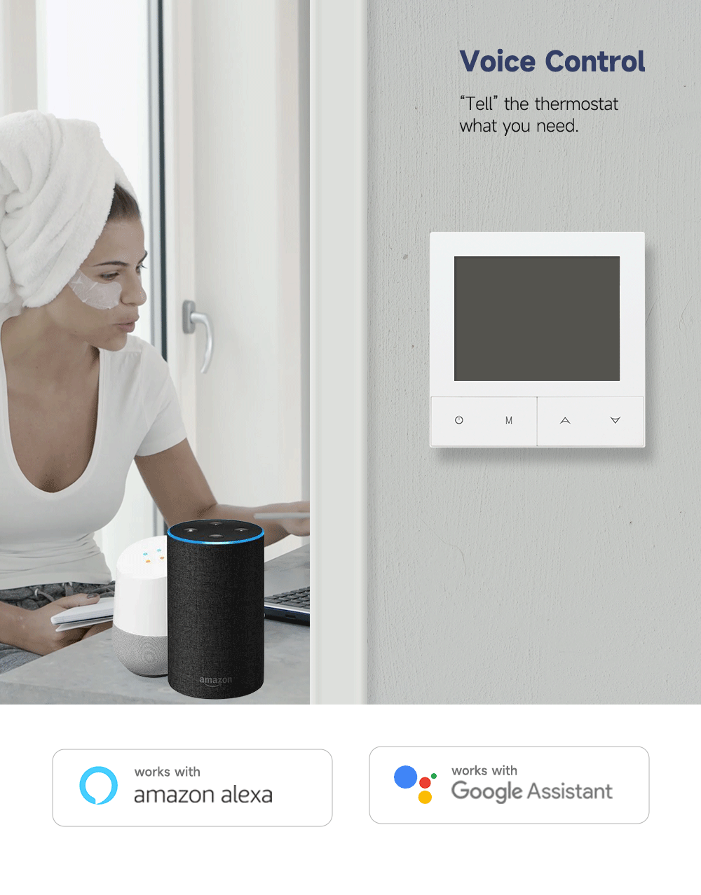 -Совместимость с Google Home и Alexa: Bluetooth и Wi-Fi можно использовать для быстрого подключения к вашему мобильному телефону, действия просты; голосовое управление интеграцией умного дома и отоплением с помощью Amazon Alexa и Google Assistant. Просто введите голосовую команду, чтобы включить и выключить термостат, и даже установите его на определенную температуру по мере необходимости. Температура окружающей среды: от 5 до 99 ° C (например, Alexa, установите в гостиной 20 °).