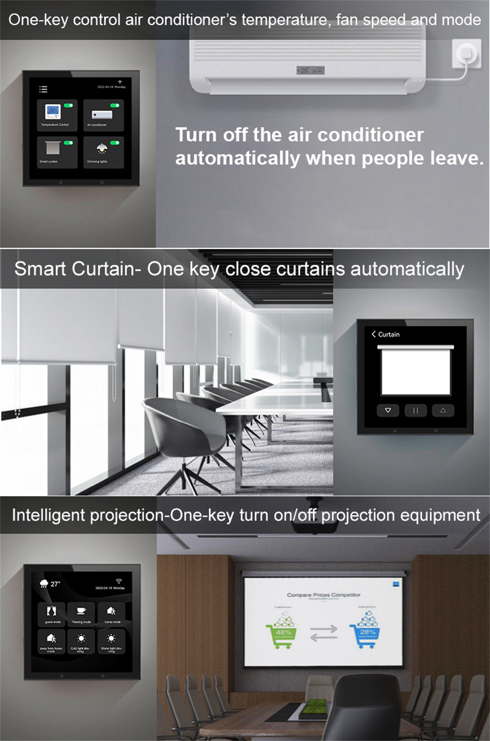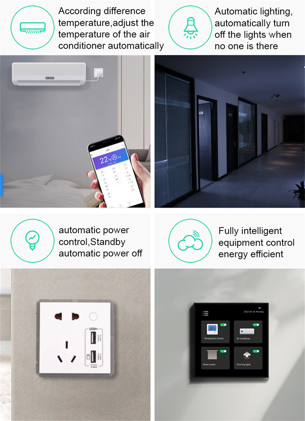 [Центр управления умным домом] --- вы можете управлять всеми смарт-переключателями, умными розетками, интеллектуальными датчиками, умными огнями, умными переключателями штор и т. д. вы также можете управлять умными сценами одним щелчком мыши. Подходит для сцен умной автоматизации в приложении smart Life, можно добавить до 16 режимов сцены.