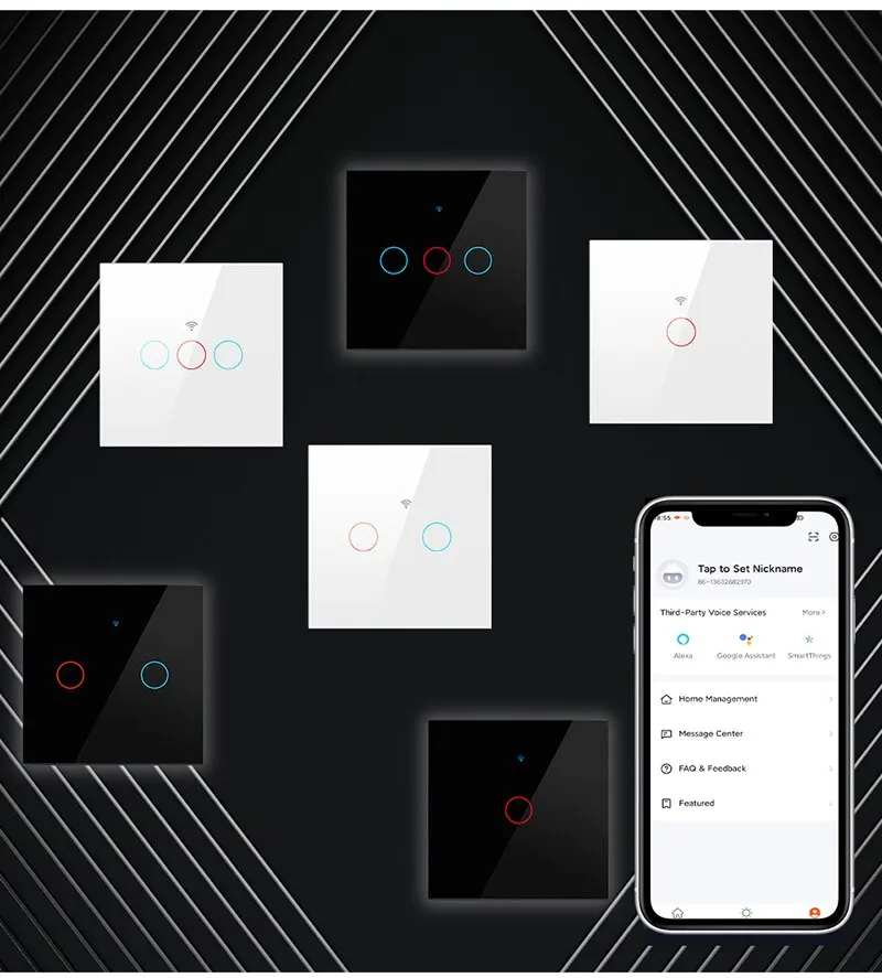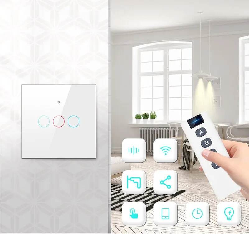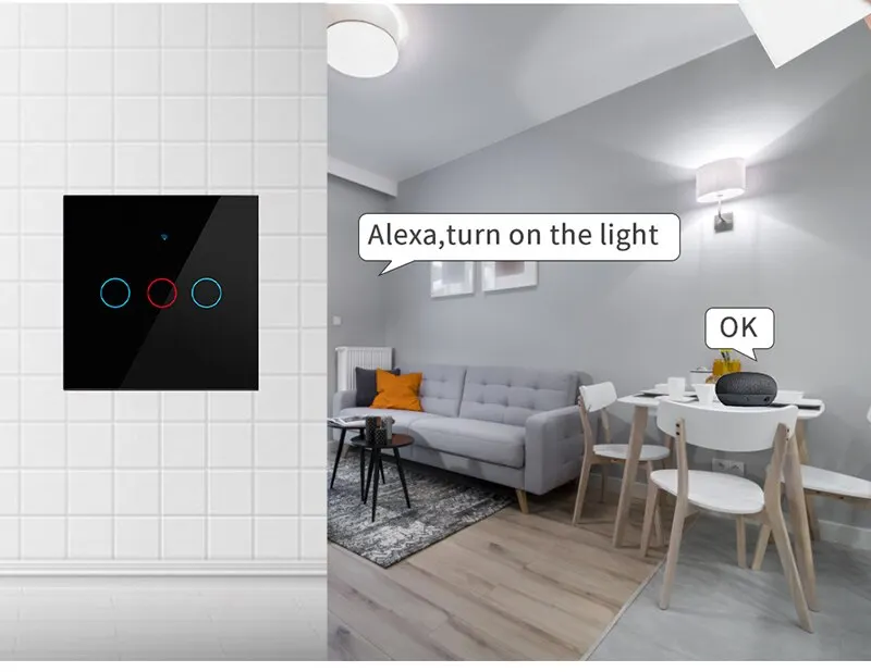 Умный переключатель Tuya WiFi-это беспроводной настенный сенсорный переключатель для освещения без нейтрального провода, совместимый с Alexa, Google Home и 433RF. Доступен в конфигурациях 1/2/3 группы.