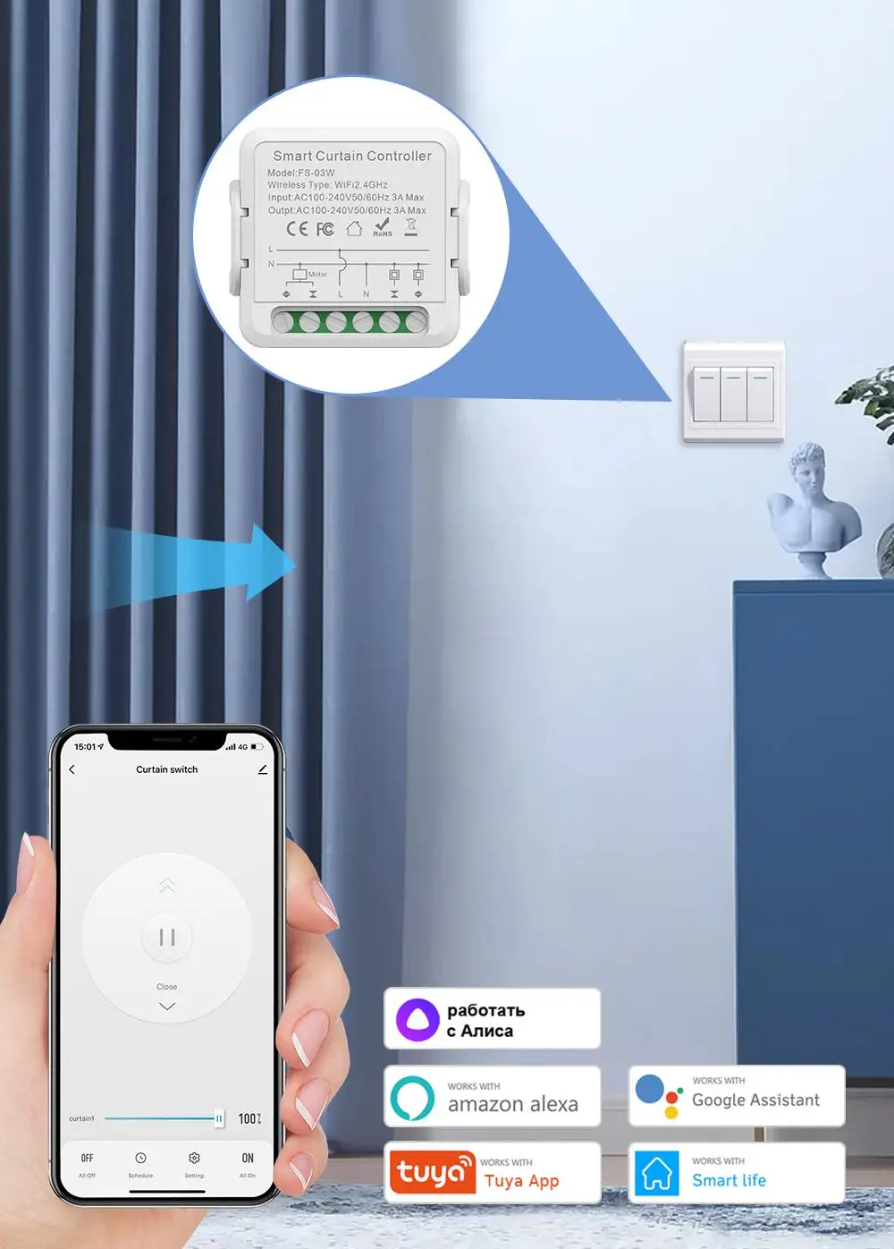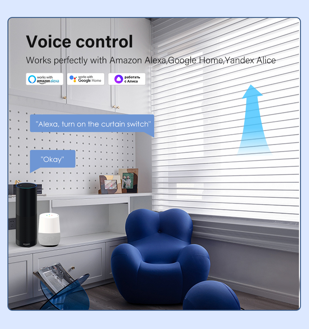 【Поддержка голосового управления】 Переключатель совместим с Alexa и Google Home Assistant, что позволяет использовать интеллектуальный переключатель голосового управления для включения/выключения. (Шторы, которые не поддерживают Голосовое управление для процентов открытия)
