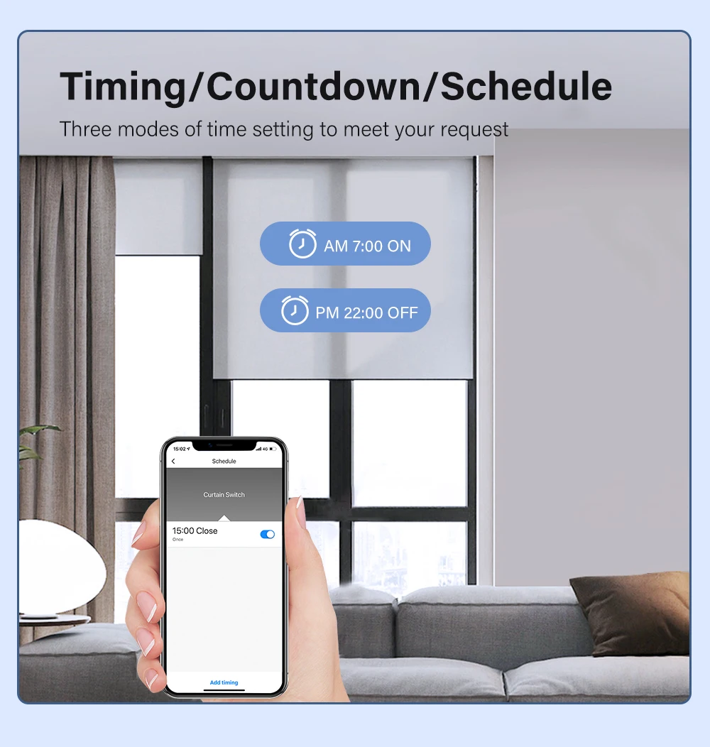【Сроки 】 Интеллектуальный переключатель автоматически включается и выключается в определенный момент времени с помощью функции таймера. Выберите время, когда вы хотите проснуться, автоматически Откройте шторы, чтобы вы могли легко войти в день; выберите время, когда вы хотите закрыть шторы.