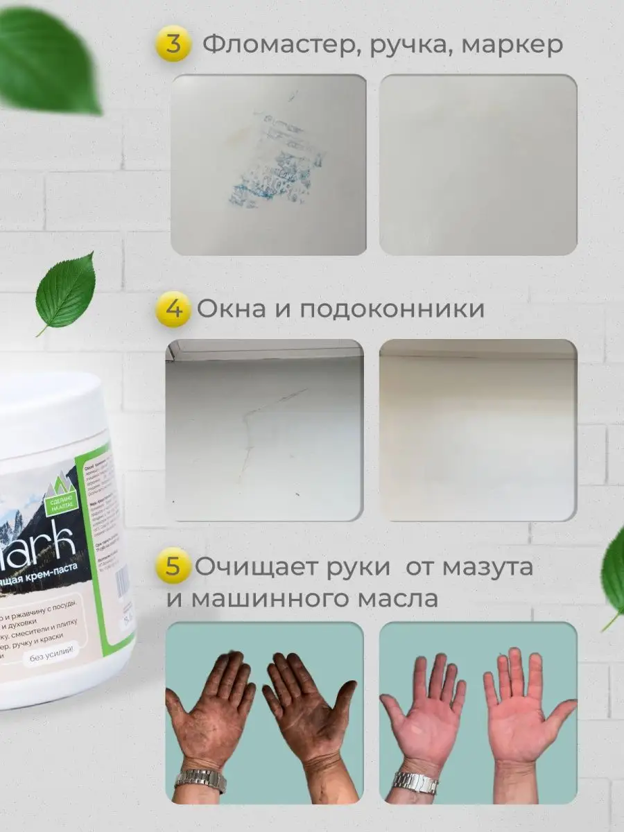 Описание: Чистящая паста представляет собой универсальное средство для эффективной уборки различных поверхностей в доме. Она идеально подходит как чистящее средство кухни, ванной комнаты и других помещений, где накапливаются загрязнения. Паста имеет приятный запах и безопасна для кожи рук. Мягкий абразив, помогает бороться с различными типами грязи, включая жир, камень, плесень и известковый налет. Благодаря своей текстурной форме, паста легко наносится и равномерно распределяется по поверхности. Она идеально подходит для мытья кухонных поверхностей, таких как плитка, столешницы, раковины и духовка. Кроме того, она эффективно очищает унитазы, душевые кабины и акриловые ванны. То самое средство легко справится с чистотой рук после авторемонтных и малярных работ. Отлично очистит белую обувь. Паста обеспечивает отличные результаты уборки, сохраняя блеск и белизну поверхностей без их повреждений. Это универсальное чистящее средство может использоваться в различных областях уборки дома и удалит даже самые сложные загрязнения, обеспечивая идеальную чистоту и свежесть в вашем доме. Чистящая паста для уборки это лучший выбор для всех заботливых хозяев.