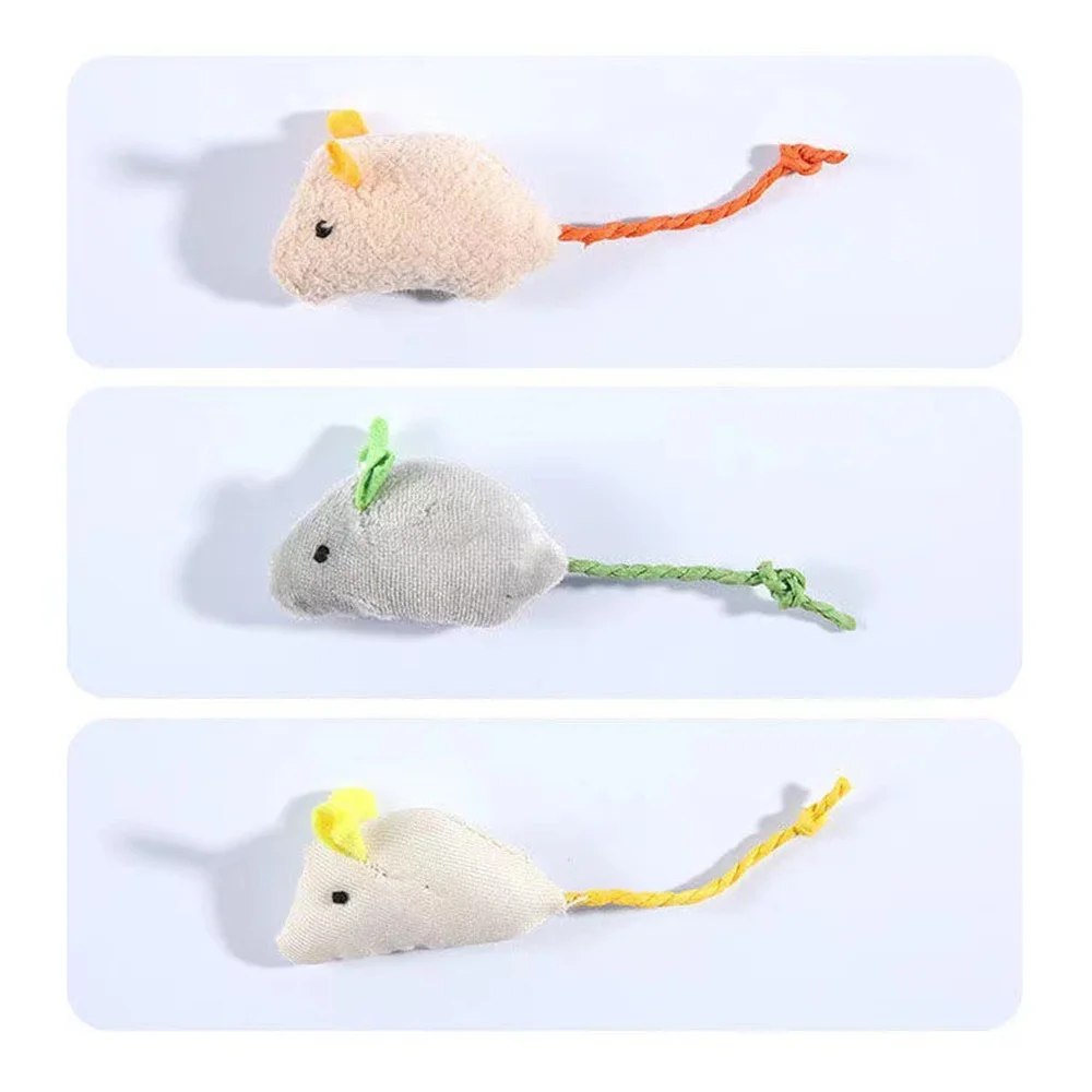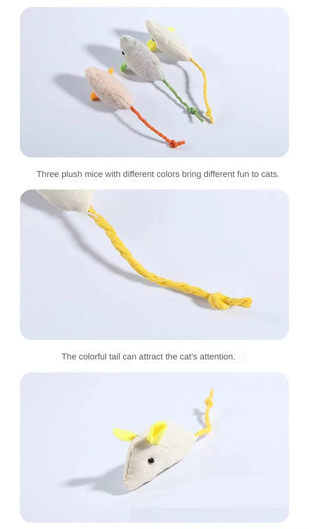 2. Три плюшевых мыши разных цветов приносят разные развлечения кошкам