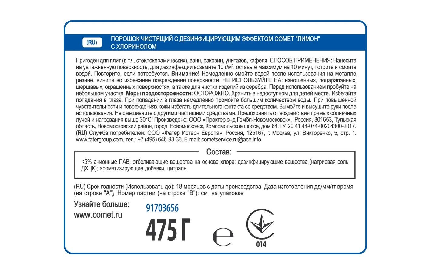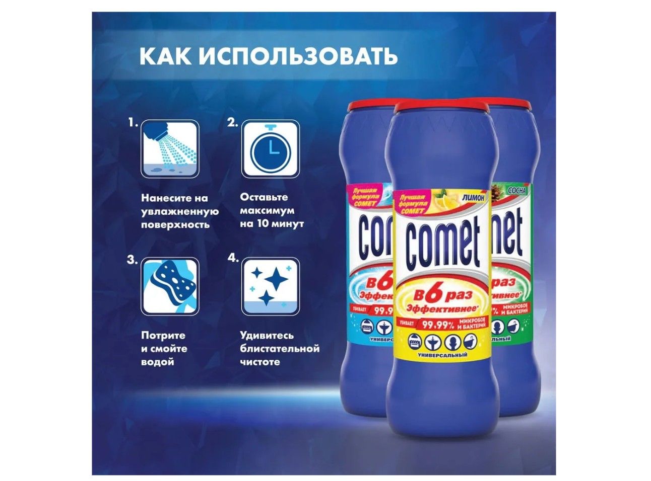 Описание: Универсальный чистящий порошок Comet — главный герой на кухне каждой хозяйки. Формула глубокого очищения справляется с задачами любой сложности. Мелкие гранулы эффективно растворяют самые стойкие загрязнения, придавая сияние всем поверхностям. Порошок Comet — это идеальный выбор для получения непревзойденного результата!ЗаголовокУниверсальный чистящий порошок Comet — главный герой на кухне каждой хозяйки. Формула глубокого очищения справляется с задачами любой сложности. Мелкие гранулы эффективно растворяют самые стойкие загрязнения, придавая сияние всем поверхностям.